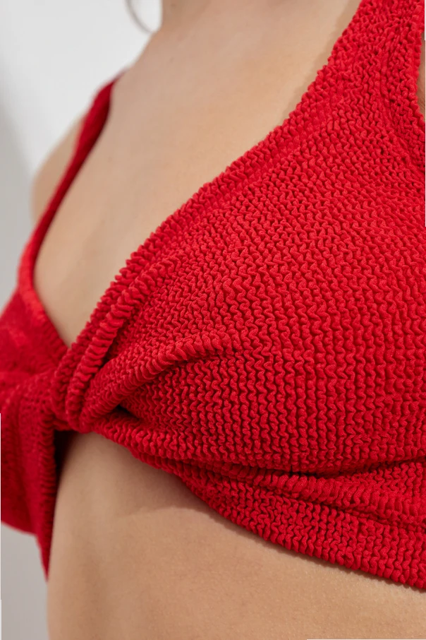 Immerse yourself in understated sophistication with the Coverage Juno two-piece swimsuit by Hunza G . This classic bikini in timeless black features a feminine silhouette brought to life by a contemporary twist detail at the center of the wide-strap top, lending a subtle, decorative knot that elevates its allure.