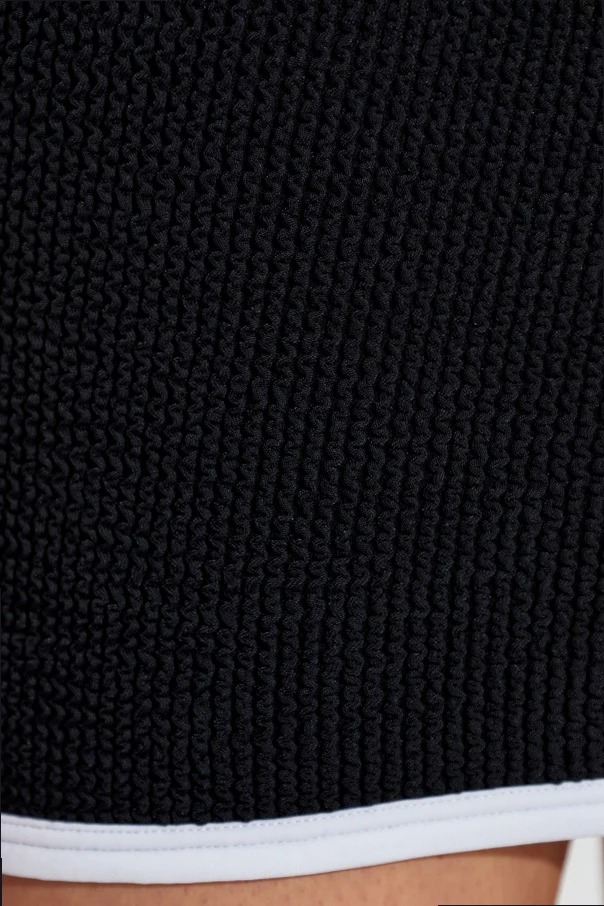 Introducing the Devyn Beach Skirt by Hunza G, a refined embodiment of contemporary beachwear elegance. Rendered in striking black , this mini skirt features a sleek, fitted silhouette that gracefully accentuates the figure. Its distinctive textured knit fabric brings breathable comfort and effortless summer charm, making it an impeccable choice for sun-drenched retreats. Minimalist by design, the Devyn skirt is enhanced with bold white contrast trims at the waist and hem, imparting a subtle yet modern athletic allure. Unadorned by logos or extraneous details, every element speaks to a polished simplicity that captures discerning tastes. Why choose this product? Luxurious, textured knit ensures comfort and a perfect fit Contemporary white contrast edging for a sophisticated touch Timeless black hue complements a wide range of styles Streamlined, logo-free design for understated elegance Expert craftsmanship by Hunza G