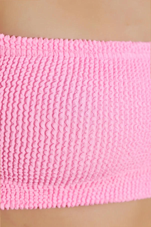 The Gigi Two-Piece Swimsuit by Hunza G epitomizes refined simplicity with its impeccably balanced design. Featuring a sleek bandeau top resting on slender straps and classic high-cut bottoms, this ensemble gracefully celebrates the natural silhouette. Crafted from a sumptuously textured, elastic knit fabric, it envelops the body with comfort while offering a subtle architectural dimension. The material’s densely woven, three-dimensional structure lends an air of sophistication, while the absence of overt embellishments or visible logos underscores its understated allure.