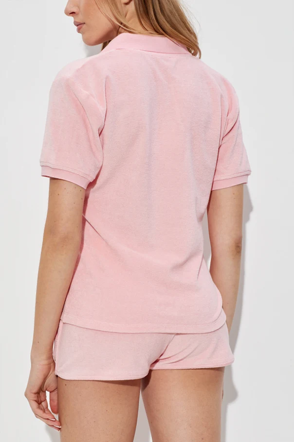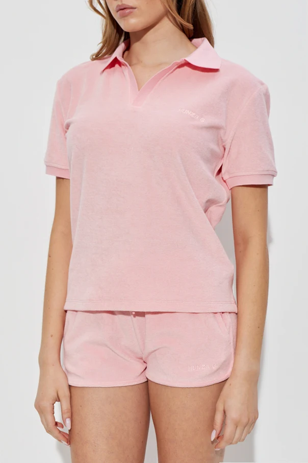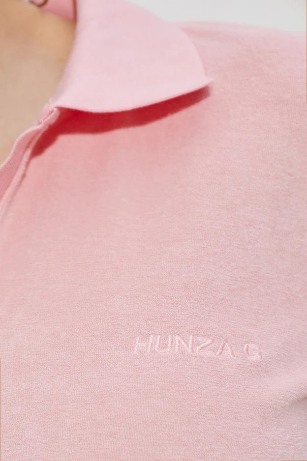 Immerse yourself in understated refinement with this light blush pink terry cotton polo from Hunza G . Designed with a classic, gently tailored silhouette, its softly textured, looped terry cotton elevates comfort and adds tactile intrigue to your ensemble. The distinct V-shaped neckline, finished without buttons, is complemented by a pronounced collar for a modern twist on tradition. Crafted in a solid, patternless hue with a smooth surface, this polo is expertly finished with minimalist hems at the sleeves and hemline. The discreet Hunza G logo, subtly embroidered on the left chest in a tonal shade, underscores its quiet sophistication—making it a versatile essential for the discerning wardrobe. Why choose this product? Exceptional terry cotton for unparalleled softness and breathability Elegant, classic cut enhanced by a modern V-neckline Minimalist tonal logo for a refined, exclusive look Versatile blush pink shade, perfect for effortlessly polished styling Signature craftsmanship by Hunza G