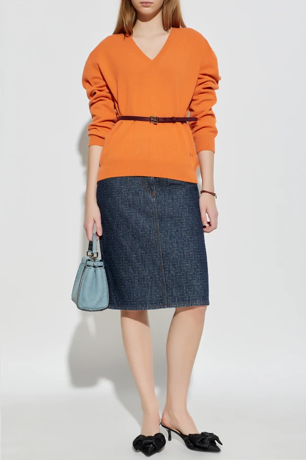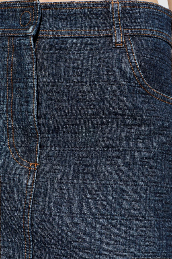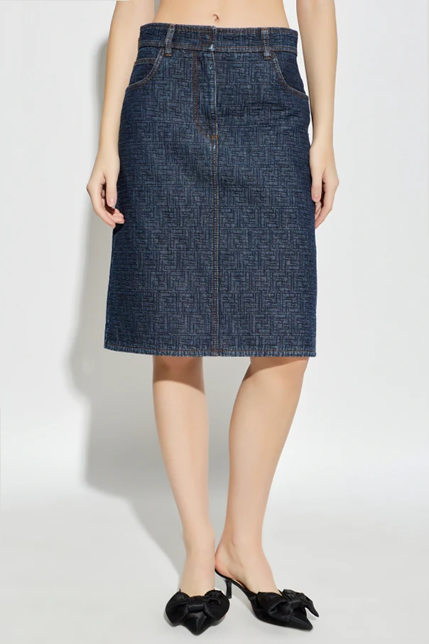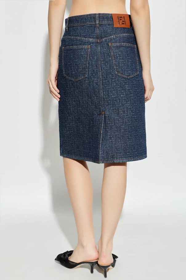 Embrace modern sophistication with this distinctive mid-length pencil skirt by Fendi , expertly crafted in premium dark navy denim. The skirt’s impeccable cut offers a refined silhouette, striking a balance between classic poise and effortless comfort. Its sumptuous cotton fabric boasts a polished geometric monogram pattern throughout—a subtle yet unmistakable nod to the designer’s signature aesthetic. Elegant orange topstitching and traditional seams provide a refined contrast against the deep hue, while practical touches include two angled front pockets, a wide button tab with a discreet zipper, and two generously sized patch pockets on the back. A thoughtfully placed rear slit ensures graceful movement, elevating the skirt’s wearability for both formal moments and relaxed sophistication. Why choose this product? Luxurious, high-quality dark navy denim Exclusive geometric Fendi monogram design Functional pockets and elegant details Perfect knee-grazing pencil shape for versatility Sophisticated contrast stitching for designer allure