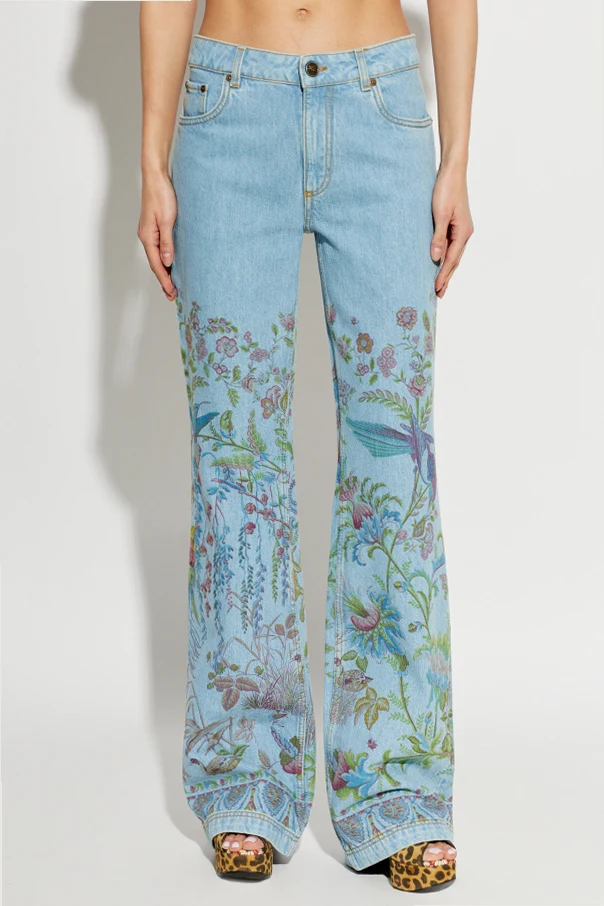 Distinctive artistic botanical motifs —floral, branch, and bird compositions—are thoughtfully placed in vivid, multicolored prints along the lower legs. Each pair is accentuated by a bold decorative band at the cuffs, complemented by signature yellow-orange topstitching and gleaming metal hardware. Classic five-pocket styling, including a riveted coin pocket, enhances the jeans’ functional allure.