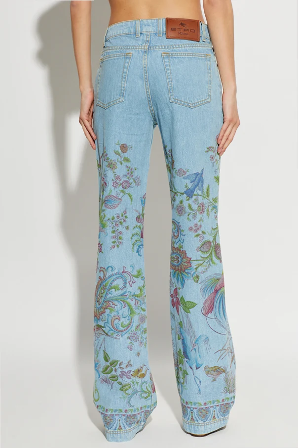 Elevate your wardrobe with these exclusive flare jeans from the esteemed Etro collection. Exquisitely crafted from premium, non-stretch denim in a light blue, subtly faded finish , these jeans evoke timeless vintage sophistication. The silhouette features a classic mid-rise and dramatically flared legs, radiating contemporary femininity.