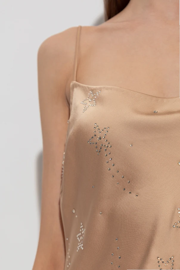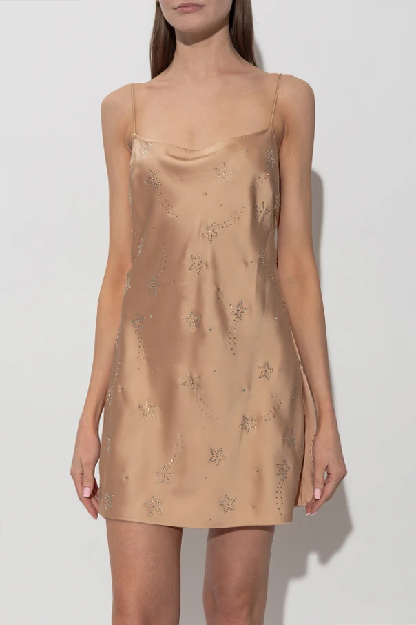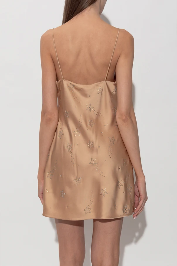 Discover the allure of refined simplicity with the Kalora dress by LoveShackFancy. Rendered in an exquisite, lustrous satin-like polyester , this mini silhouette envelops the figure with a gently relaxed drape, elegantly fluttering just above the knee. The understated charm of its subtle cowl neckline is elevated by delicate, whisper-thin straps that embody sophisticated grace. A constellation of tiny crystal and jet embellishments, thoughtfully arranged as decorative stars and scattered luminous accents, adorns both front and back — an ode to modern opulence. The absence of visible seams enhances the design’s minimalist ethos, while the sleeveless construction encapsulates contemporary elegance without unnecessary distraction. Why choose this product? Finely crafted from premium, satin-sheen polyester for an indulgent feel Unique crystal and jet star embellishments evoke subtle luxury Expertly tailored relaxed mini cut flatters effortlessly Minimalist construction with seamless front for pristine charm Exclusively designed by LoveShackFancy for the discerning wardrobe