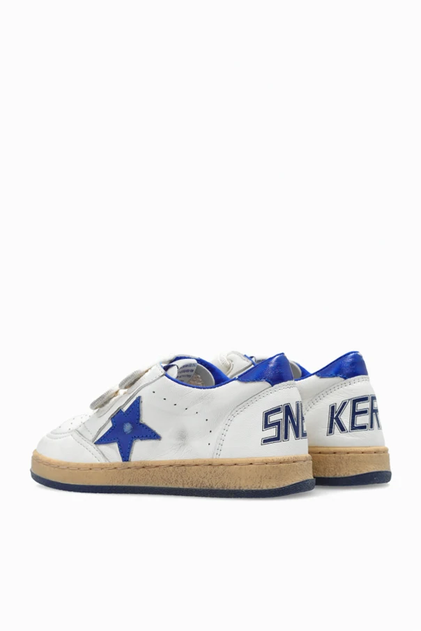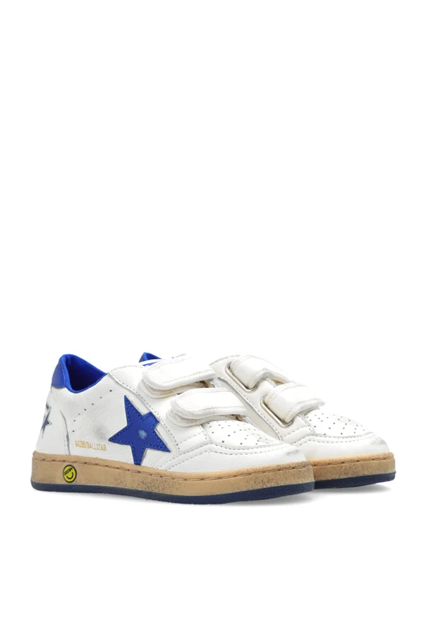 White ‘Ball’ sneakers with a worn effect from Golden Goose Kids. Made of leather, this pair features velcro fastening, blue trimming, perforations on the front, logo pattern, the brand's signature star patch and rubber sole in navy and beige.