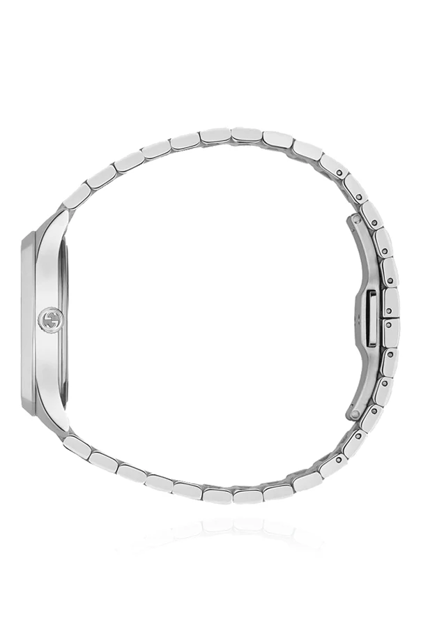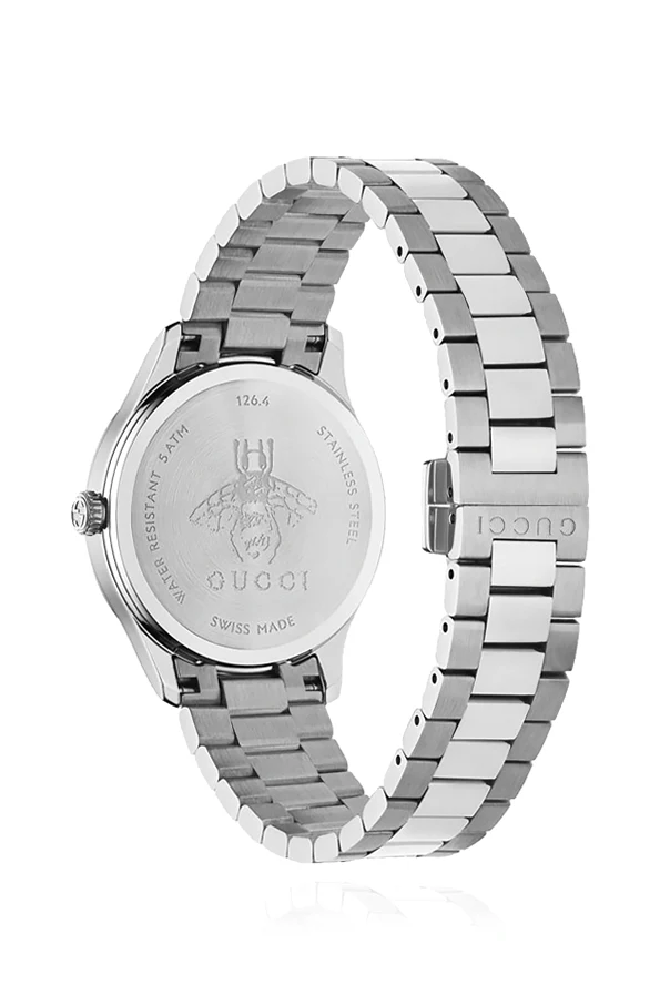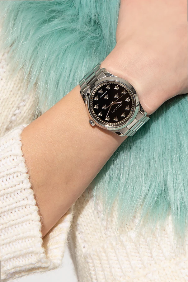 Silver-tone and black ‘G-Timeless’ automatic watch from Gucci. With a 32mm steel case, this model features an onyx dial enriched by the brand's signature engraved bee and logo, sapphire glass with antireflective coating and a steel bracelet with a branded fastener.