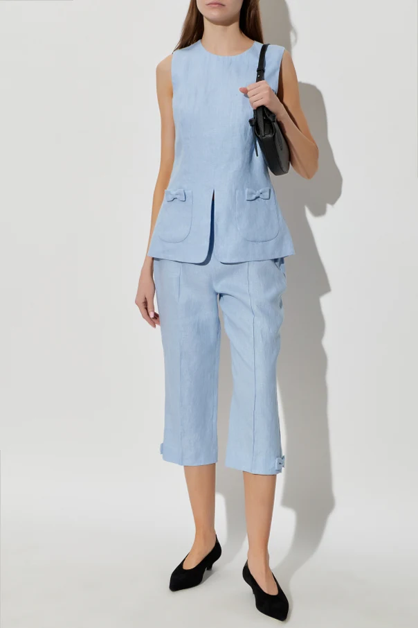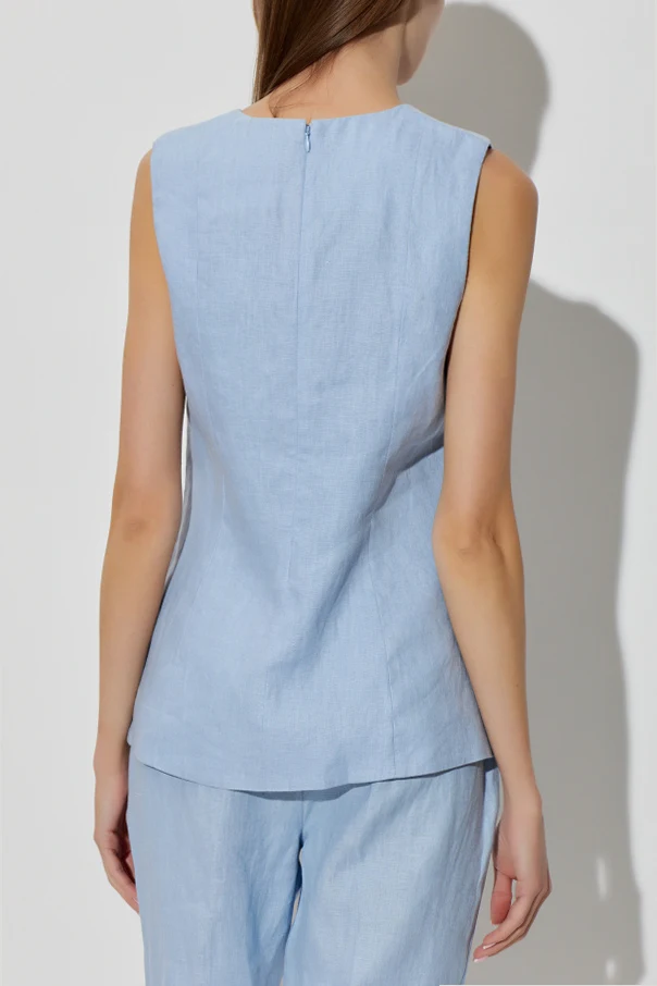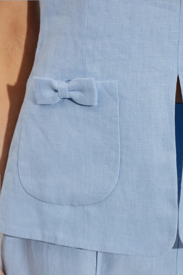 The Harper Top by Posse epitomizes refined sophistication, rendered in a serene light blue hue. Meticulously crafted from premium natural fibers—linen and cotton—the subtly textured, matte fabric envelops you in airy comfort while maintaining an effortlessly polished silhouette. Designed with a gently tailored, straight cut that gracefully skims the hips, this sleeveless blouse features a classic round neckline and a distinctive center-front slit for understated allure. Two sculpted patch pockets, each adorned with an exquisite tone-on-tone bow, add an exclusive, feminine touch. The concealed back zipper ensures seamless wear and a pristine finish—quintessential elements for the discerning wardrobe. Why choose this product? Luxurious blend of high-quality linen and cotton Elegant light blue shade for elevated versatility Delicate pocket bows enhance unique charm Flattering, modern silhouette with exquisite detailing Practical concealed zip for optimal fit and comfort