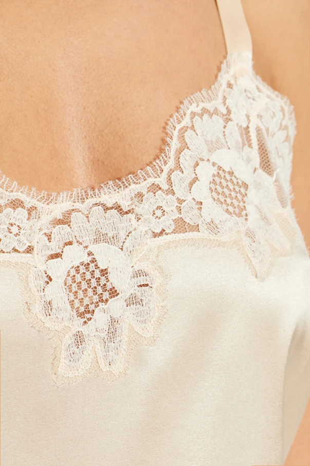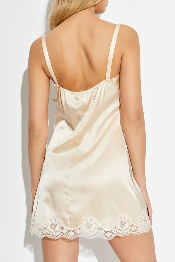 Experience refined elegance with this Dolce & Gabbana silk slip accented with exquisite lace inserts . Meticulously crafted in lustrous, smooth silk, the silhouette embraces a classic mini length, falling gracefully to mid-thigh. Delicate, adjustable straps and a gently rounded neckline ensure timeless sophistication with a touch of modern sensibility. Distinctive, broad lace appliqués—rendered in a harmonious, floral motif—adorn both the neckline and hem, seamlessly echoing the slip’s luxurious hue. The fluid interplay of sheer mesh and intricate florals brings an air of artistry and allure, elevating every detail. Unadorned by overt branding, this piece radiates the discreet luxury and masterful craftsmanship synonymous with its celebrated Milanese origins. Why choose this product? Exclusively fashioned from premium silk for unmatched comfort Signature Dolce & Gabbana design—subtle, sensual, and artfully adorned Elegant floral lace with delicate mesh, thoughtfully placed for a refined finish Adjustable straps for a tailored, flattering fit Minimalist aesthetic that seamlessly balances opulence with understated grace