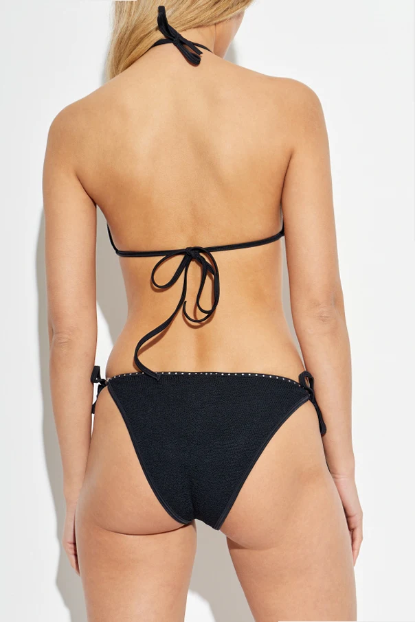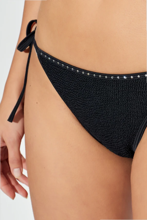 Introducing the Gina two-piece bikini by Hunza G —an embodiment of refined minimalism for the discerning aesthete. Crafted from artfully textured fabric, this classic black triangle set delivers an understated yet captivating silhouette. The top features adjustable ties at the neck and back, accentuating comfort and versatility without the distraction of padding or underwiring. Both the triangle cups and the coordinating bottoms, designed with elegant side ties, are thoughtfully adorned with delicate embellishments—subtle crystal accents and metallic touches grace the edges, adding a whisper of opulence while maintaining a sophisticated allure. The absence of prints, logos, or overt designer markings ensures an eternally relevant, streamlined look, while the softly ruched material brings inviting dimension and tactile distinction. Perfect for those who appreciate true craftsmanship and graceful restraint. Why choose this product? Unique ruched texture for a three-dimensional effect Unrivaled comfort with fully adjustable ties Embellished with refined, elegant metallic details Timeless, minimalist design accentuated by a pure black hue Exquisitely crafted by renowned designer Hunza G