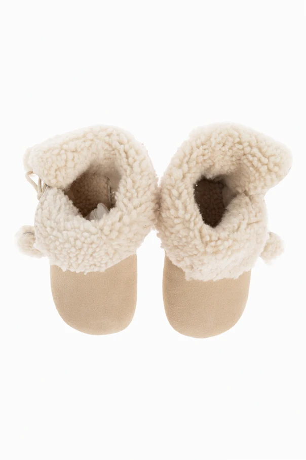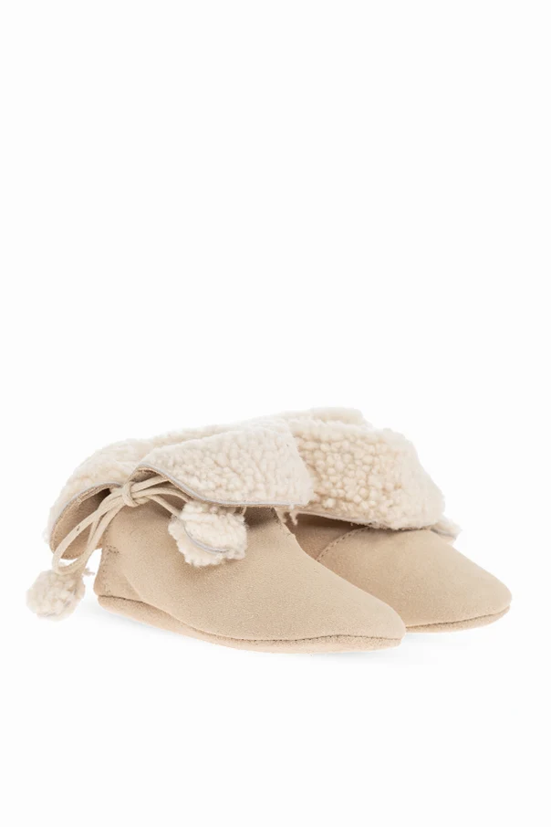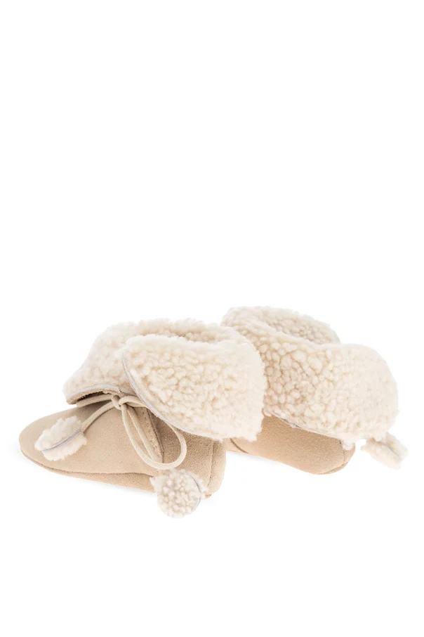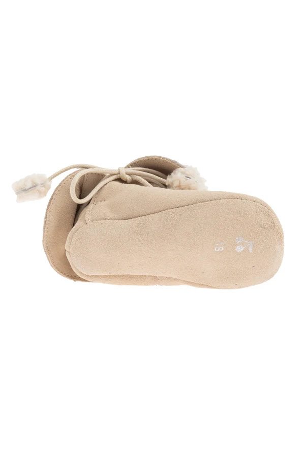 Distinctive decorative laces fasten at the front, trimmed with playful, fur-like pom-poms that offer both an adjustable fit and a delightful, whimsical accent—hallmarks of Bonpoint’s celebrated French craftsmanship.