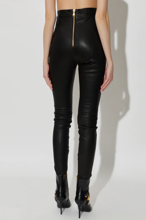 Balmain introduces the epitome of sophistication with these leather skinny-fit trousers in classic black . Crafted from luxuriously smooth lambskin, their figure-hugging silhouette and high-rise waist flatter the feminine form while exuding timeless Parisian allure. The seamless, pattern-free design is elevated by a striking golden metallic zipper placed at the center back—an exquisite detail that redefines modern elegance. Devoid of visible pockets or decorative stitching, these trousers embody refined minimalism, allowing the sumptuous texture and exquisite tailoring to take center stage.