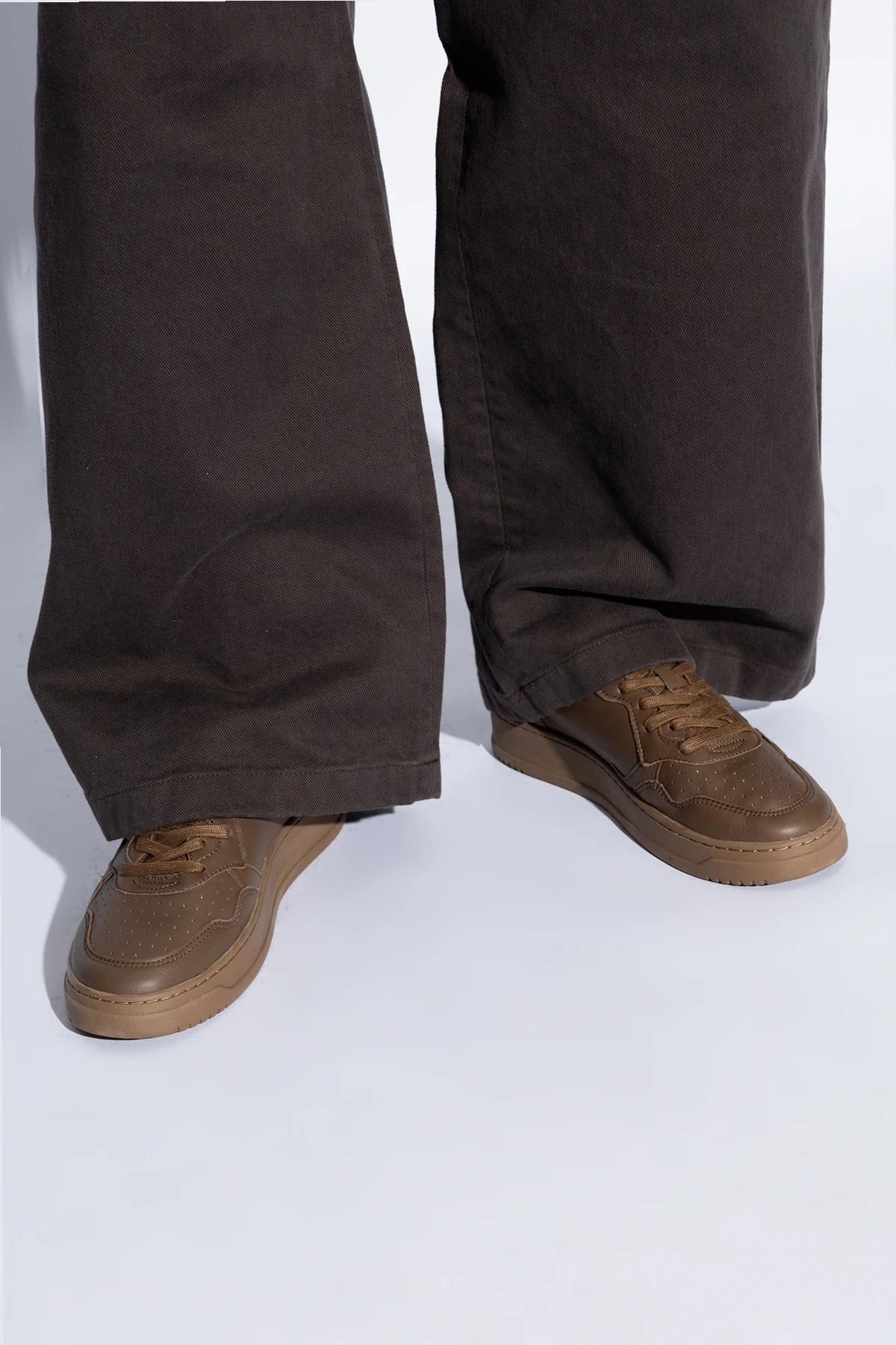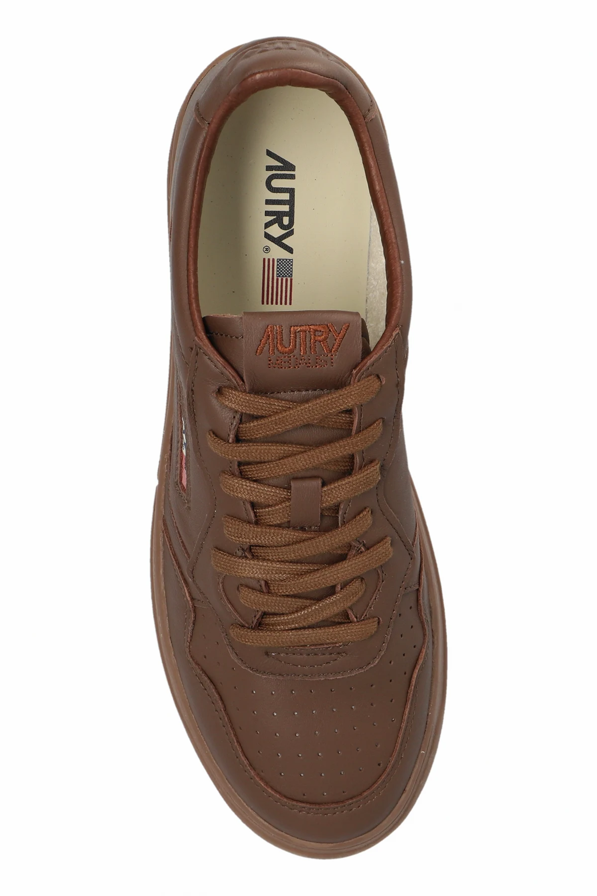 Introducing the exquisite Medalist Low sneakers by the renowned brand Autry. These exclusive brown athletic shoes are a testament to refined craftsmanship and sophisticated style. Crafted from high-quality leather, the Medalist Low sports a classic, low-top design. Its sleek brown exterior is complemented by the distinctive Autry logo adorned with the American flag on the side and tongue, adding a touch of patriotic elegance. The thoughtful design includes perforations on the front for optimal ventilation, ensuring your feet stay cool. The brown sole harmonizes with the overall aesthetic, providing a seamless and unified look. Additionally, the heel features the iconic \"AUTRY\" inscription, solidifying its unique identity. Equipped with classic brown laces and a plushly lined interior, these sneakers promise unparalleled comfort and a secure fit for all-day wear. Why Choose This Product? High-quality leather construction for durability and style. Classic, low-top design suitable for various occasions. Perforated front for enhanced breathability. Distinctive Autry logo with American flag for a premium look. Plush interior lining ensuring maximum comfort.