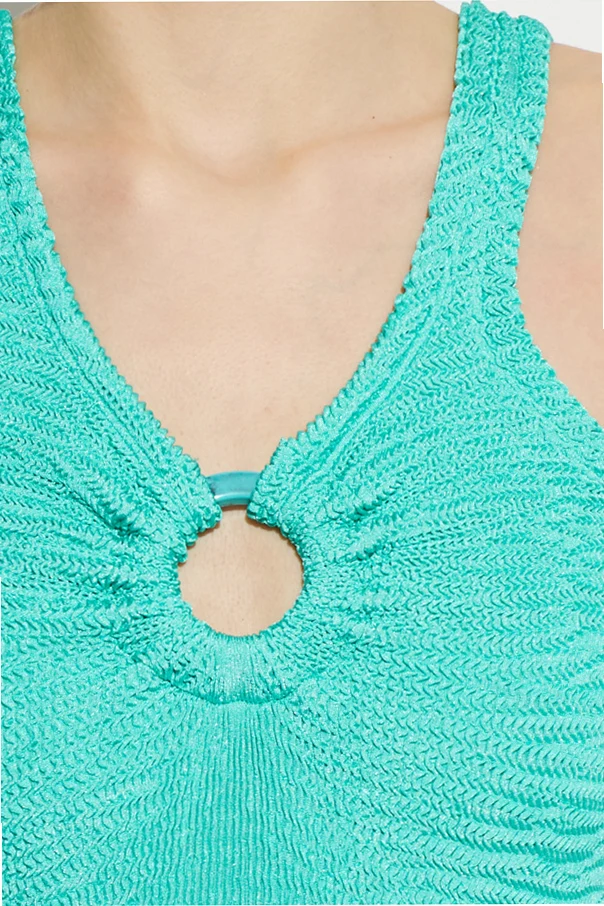 The piece is fashioned from a supple, textured fabric defined by its striking ruched pattern, gracefully embracing the body's contours for a flawless, comfortable fit. At the heart of the design lies a singular focal point: a meticulously sculpted round cut-out at the sternum, elegantly gathered with a sophisticated acrylic ring, imbuing the swimsuit with a modern and exclusive sensibility.