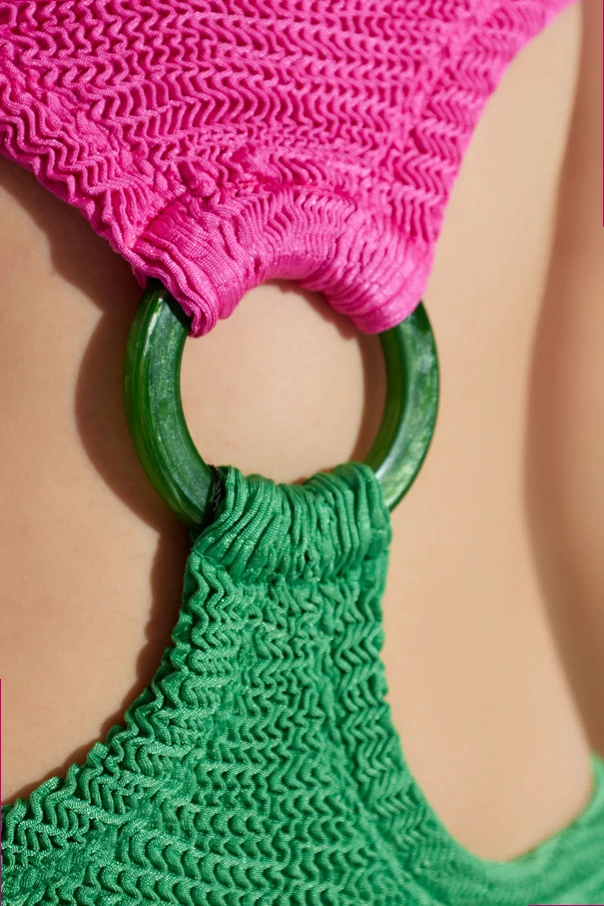 The Tanya One-Piece Swimsuit by PARAMIDONNA epitomizes contemporary sophistication, merging bold color with modern design. This striking monokini features sculptural cut-outs at each side, elegantly fused at the center with a distinctive green ring—a detail that commands attention and elevates the ensemble. The bandeau-style top in vibrant pink seamlessly contrasts with the rich green bottom, creating a visually arresting, dual-tone effect.