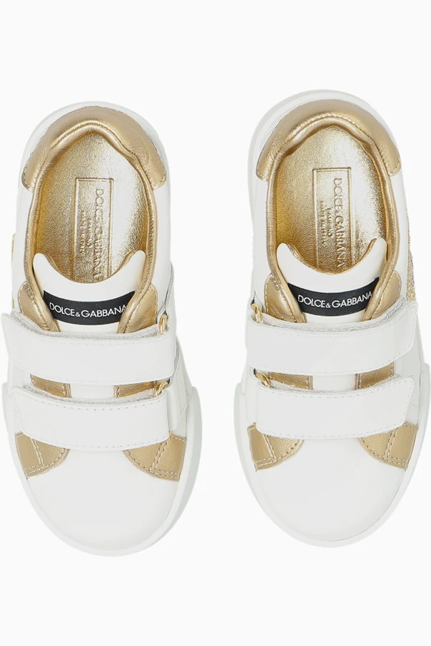 Adorned with a bold, gold glitter DG logo along the side—further accentuated by gold metallic accents at the heel, strap ends, and back—these sneakers effortlessly capture the signature extravagance of the esteemed house. Designed for convenience, the wide dual Velcro closures empower easy on-off, encouraging independence for the youngest wearers.