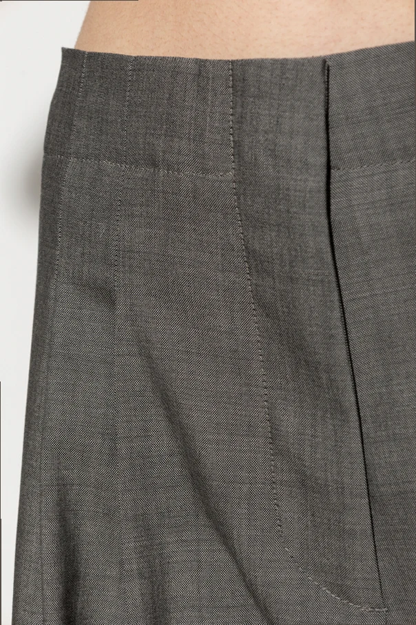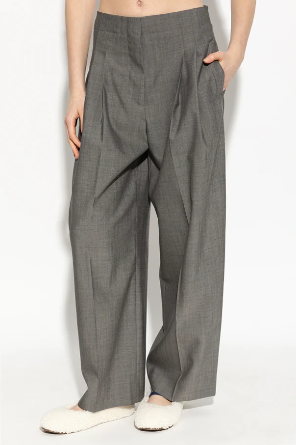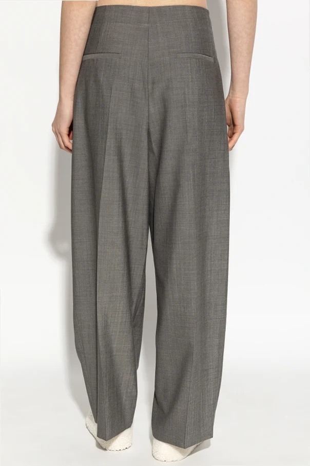 The 'Lira' wool trousers by Studio Nicholson exemplify timeless sophistication with their pure gray hue and masterfully tailored structure. Crafted from exquisitely woven wool, these trousers feature a high-rise, loose silhouette with wide, straight legs that enhance both comfort and contemporary appeal. Expertly placed, sharply defined pleats adorn both the front and back, imparting a modern, architectural contour while ensuring unrestricted freedom of movement.