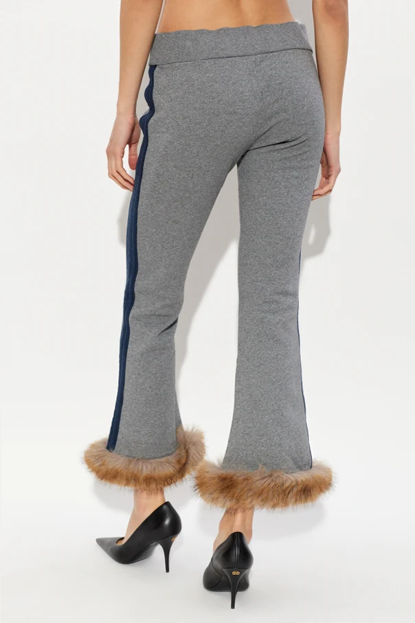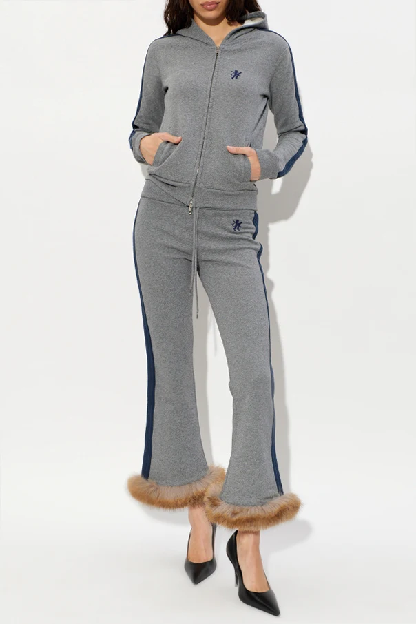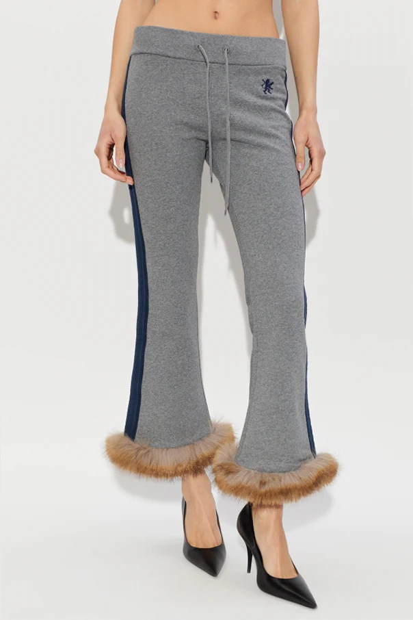 The classic, gently flared leg silhouette, elegantly accented by a bold navy stripe along each side, lends a sophisticated edge to casual wear. Plush faux fur cuffs provide a touch of luxurious artistry, while the elastic waistband with an adjustable drawstring ensures a flawless fit. The look is completed with a discreetly embroidered heraldic lion motif at the hip, affirming both exclusivity and subtle grandeur.