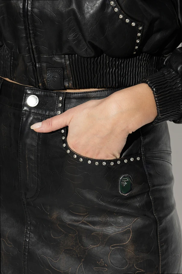 Discover the essence of confident allure with this black faux leather mini skirt by A BATHING APE® . Crafted from supple, delicately lustrous eco leather, it boasts a straight, subtly tailored silhouette that drapes gracefully to accentuate modern elegance. The distinct, irregular texture—enhanced by soft brown vintage-inspired accents—offers visual depth while evoking a sense of refined nostalgia.