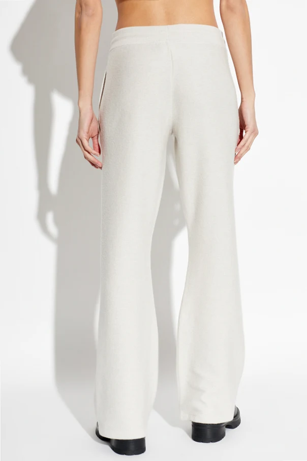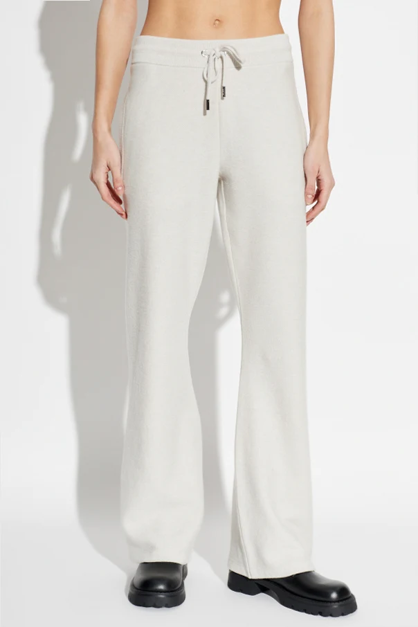 Epitomizing subtle sophistication, these cream wide-leg sweatpants from Versace fuse classic design with contemporary comfort. Crafted from an exquisite blend of premium wool and cashmere, the fabric feels exceptionally soft, offering a gentle, plush touch against the skin. The draped silhouette features a relaxed fit with high-rise waist, elegantly accentuating the figure while ensuring effortless movement. A minimalist monochrome finish highlights their refined character, enhanced by a streamlined drawstring waistband with lustrous metal accents that add a discerning detail.