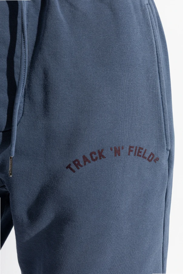 The seamless design is punctuated by a distinctive red "TRACK ‘N’ FIELD" inscription just above the left hip, elegantly showcasing the garment’s exclusive designer heritage. Elasticated cuffs and waistband, complemented by an elongated drawstring with metallic tips, ensure both exceptional comfort and effortless style.