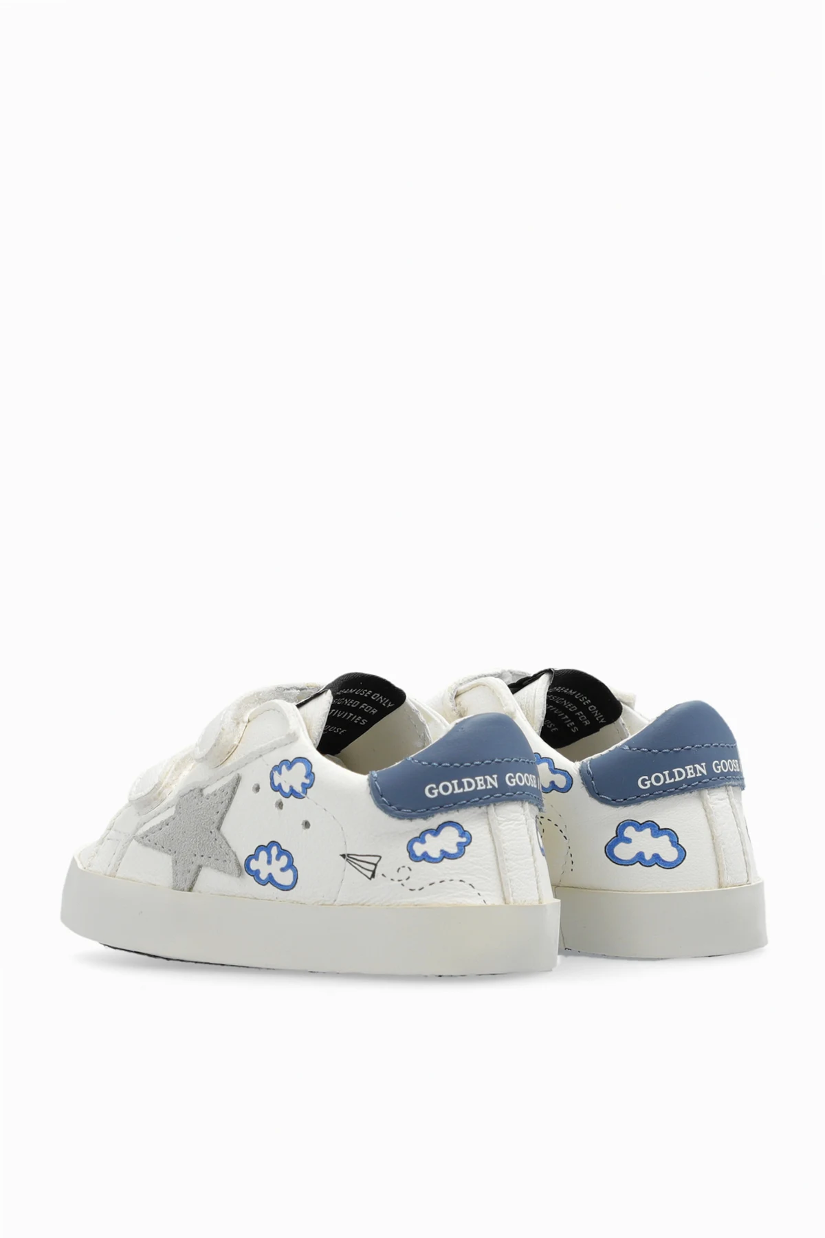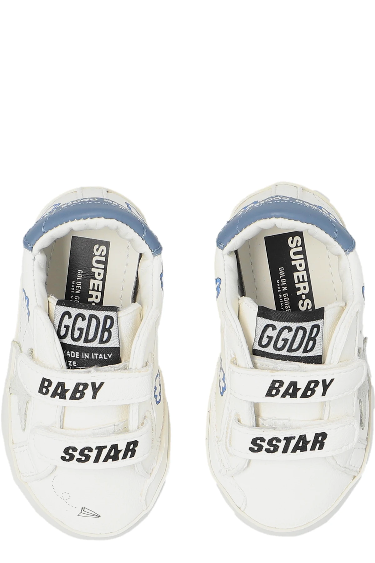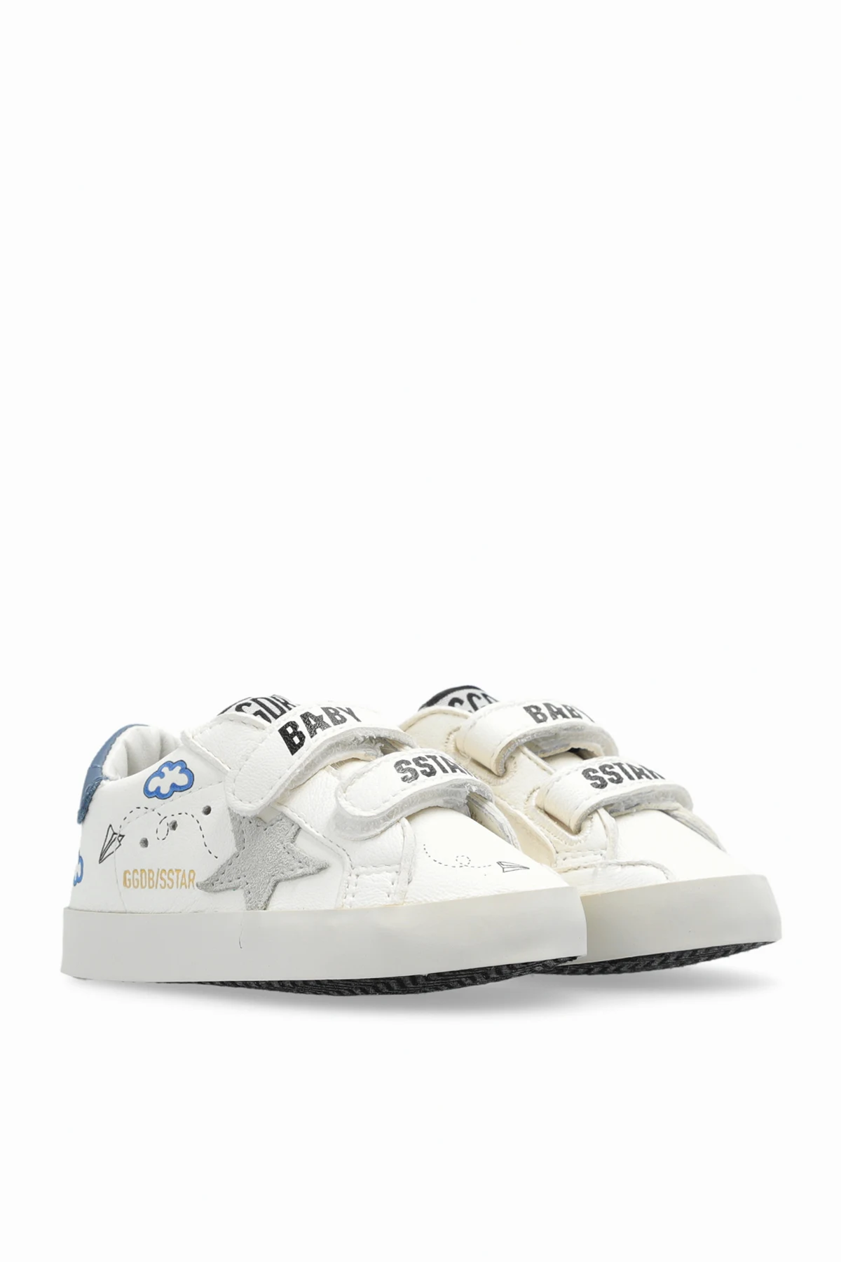 We present Baby School athletic shoes from the exclusive collection by Golden Goose. These exceptional children\'s sneakers, made from the highest quality leather, combine luxury and functionality, perfect for every day. Their classic shape and two convenient Velcro straps allow for easy on and off, which is extremely practical for the youngest. The characteristic silver star on the side of the shoes, cloud-shaped prints, and the \"BABY\" and \"SSTAR\" inscriptions on the Velcro straps emphasize the unique design typical of the Golden Goose brand. The dominant white color, complemented by silver, blue, and black accents, gives the shoes elegance and freshness. Every detail, including the \"GGDB\" and \"SUPER-STAR\" inscriptions on the Velcro straps and tongue, has been carefully refined to ensure a unique appearance. Made in Italy, these shoes are synonymous with the highest quality and precision craftsmanship. The Golden Goose brand is renowned for its unique style that blends traditional craftsmanship with modern design. Why should you buy this product? Made from high-quality leather ensuring durability and comfort. Exclusive design with distinctive brand motifs. Easy to put on and take off thanks to Velcro straps. Unique combination of children\'s aesthetics with luxurious finishing. \"Made in Italy\" product guaranteeing the highest quality.