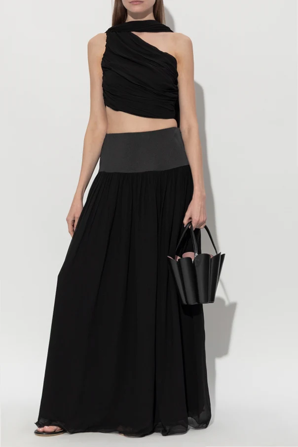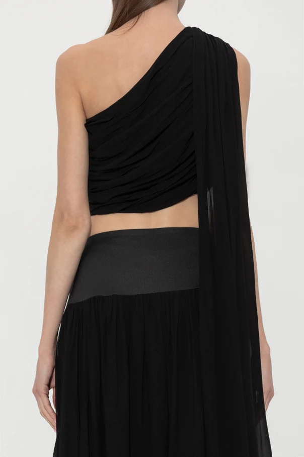 The Solene Top by Posse embodies understated sophistication through its sculptural silhouette and refined fabric choices. Delicately fashioned with an asymmetrical, single-shoulder design , this piece showcases one shoulder dramatically draped in gathered fabric, cascading in a loose, elongated panel for a truly artistic effect.