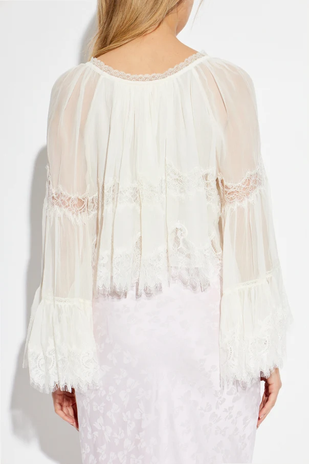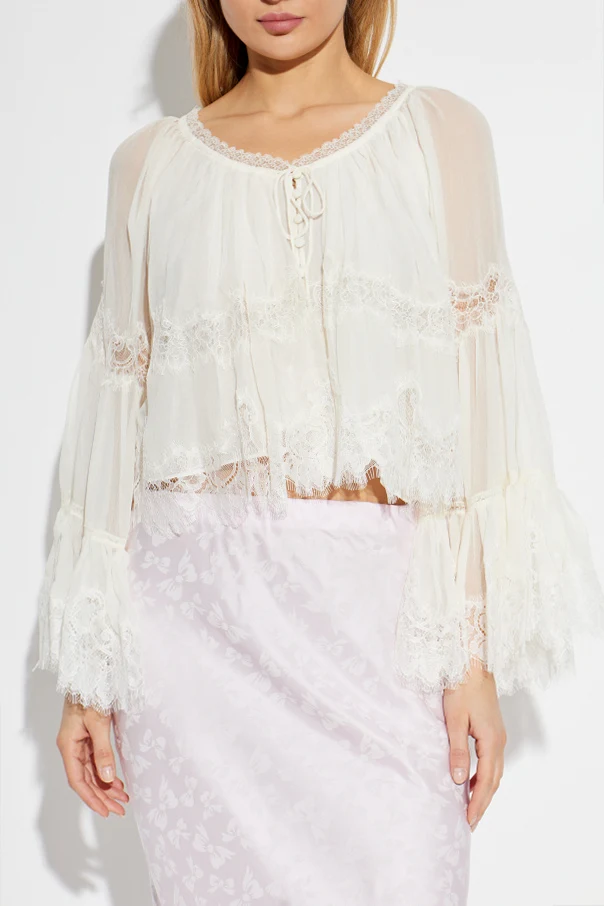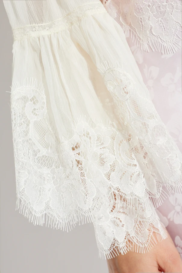 Discover effortless sophistication with the ‘Darline’ Silk Top by LoveShackFancy , a true statement of refined elegance. This ethereal piece features a relaxed, gently oversized silhouette crafted from a sheer, whisper-light silk blend, creating an enchanting sense of weightlessness. Dramatic, wide bell sleeves, finished with intricate lace, frame the garment and add a romantic flourish. The round neckline with a front tie delicately complements the fluid form, while artistry unfolds in the exquisite lace inserts gracing the sleeves, waist, and below the bust. Rendered in a solid, understated hue , and enhanced by thoughtfully placed semi-transparent silk textures, this exclusive design evokes timeless allure and contemporary ease.