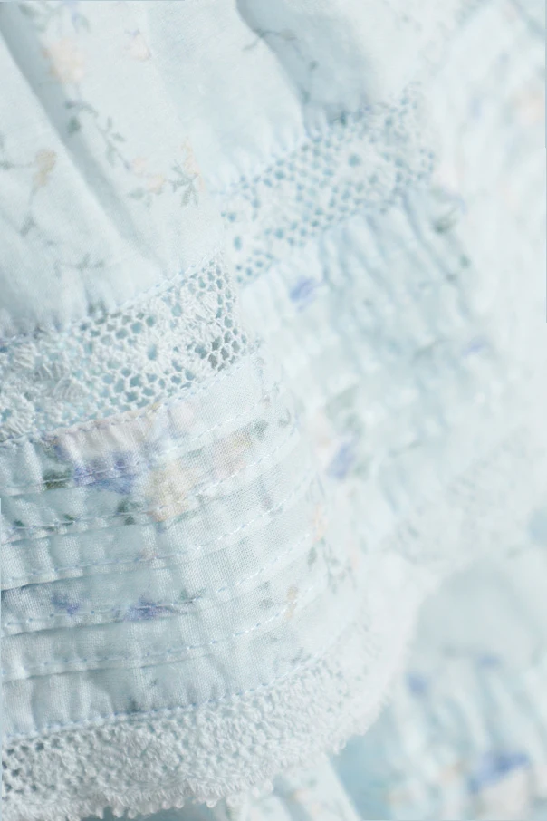 Two voluminous, layered ruffles are accentuated by delicate pleats and intricately decorative lace inserts, creating an exquisitely textured effect that highlights the garment’s unique dimension. Discreet ruching and detailed lacework further emphasize the skirt’s artisanal craftsmanship, ensuring a truly distinctive aesthetic.