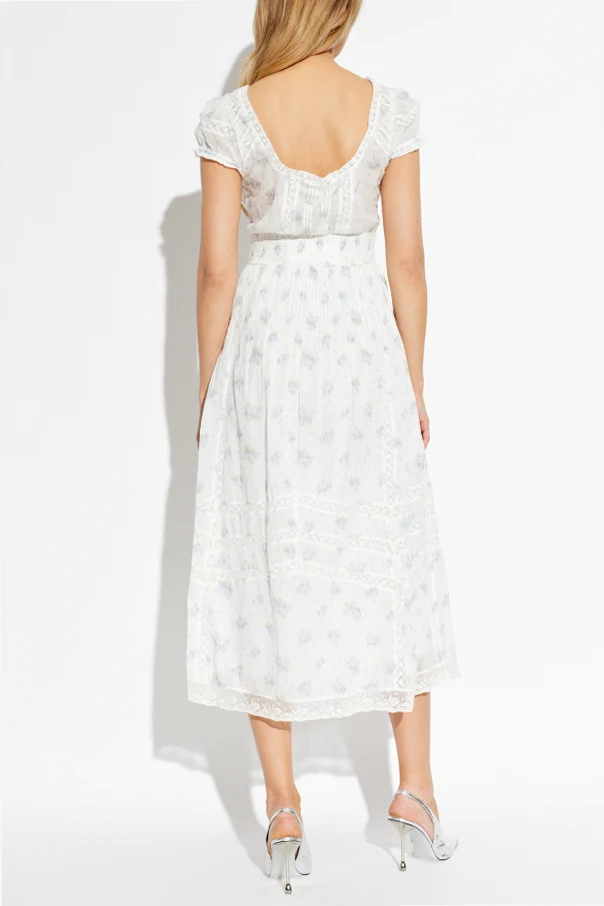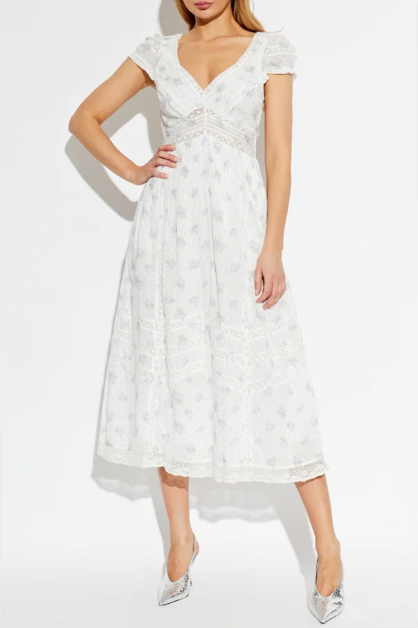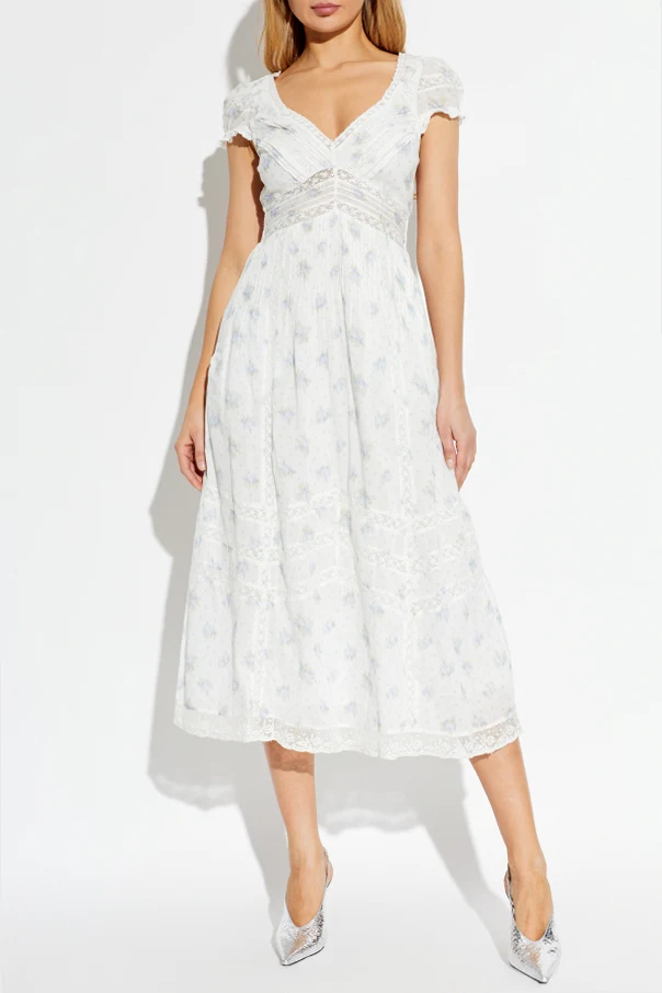 The Suvi Dress by LoveShackFancy is the epitome of feminine sophistication, designed in a pristine white hue adorned with delicate, pastel floral motifs. This midi-length dress elegantly flares with a subtly A-line skirt, while the expertly tailored bodice features short sleeves and a flattering front V-neck complemented by a softly rounded back neckline.