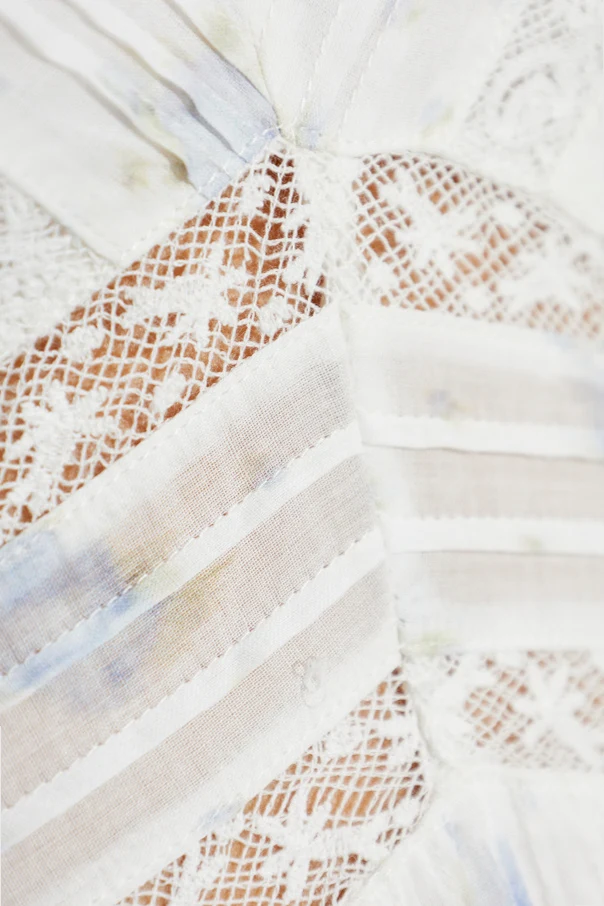 Crafted from an airy cotton fabric, with exquisite lace inserts and gentle horizontal stitched bands, the Suvi Dress envelops you in comfort and effortless grace. Intricate lace accents highlight the waist, neckline, and hem, creating an artful interplay of texture and detail that is both modern and timeless.