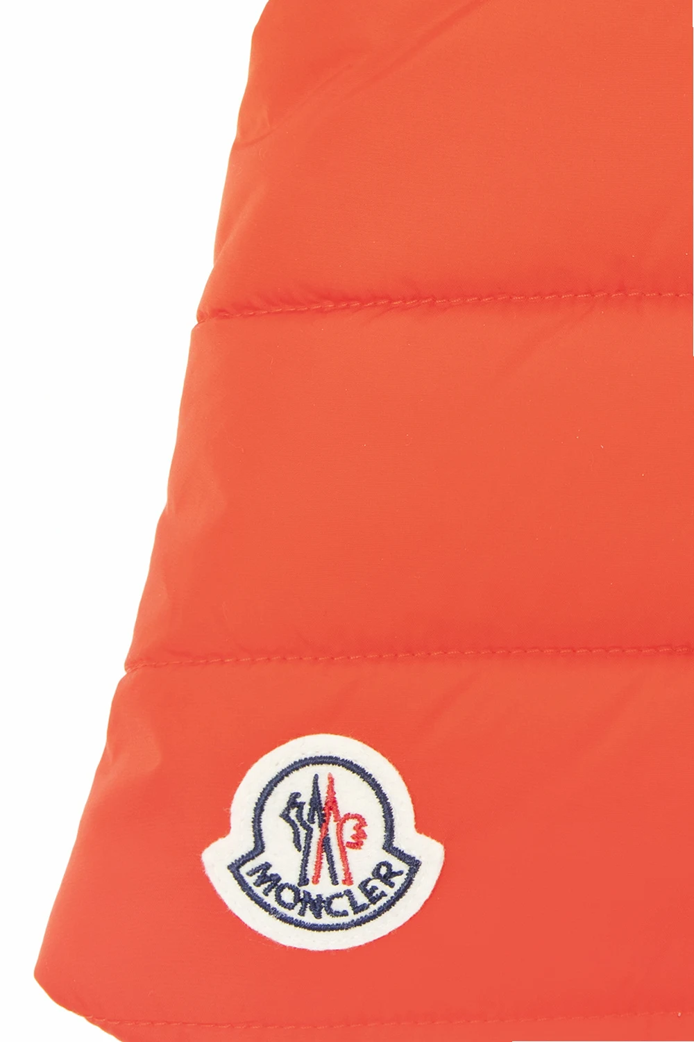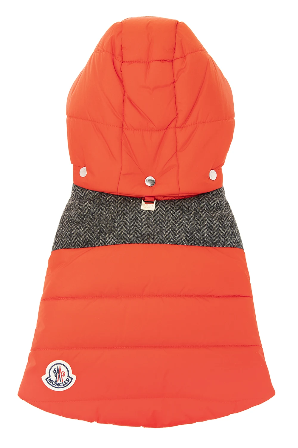 Red quilted dog vest from Moncler Genius x Poldo Dog Couture, the ‘Exclusive’ collection. Fastened with snaps, this design features a detachable drawstring hood, black and grey wool trims with a herringbone pattern, logo appliqués and silver-tone metal hardware.