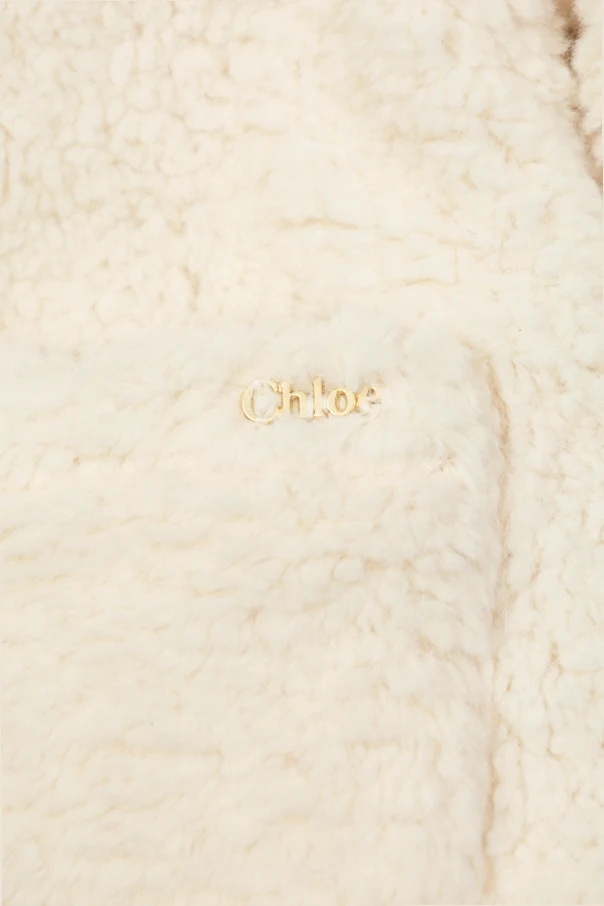 Refined in a creamy hue, the jacket’s minimalist aesthetic is accentuated by smooth faux-leather trims and a sophisticated button placket in light beige. Two front square pockets are distinguished by gold-tone metal hardware, showcasing the signature Chloé logo—a subtle mark of designer distinction.