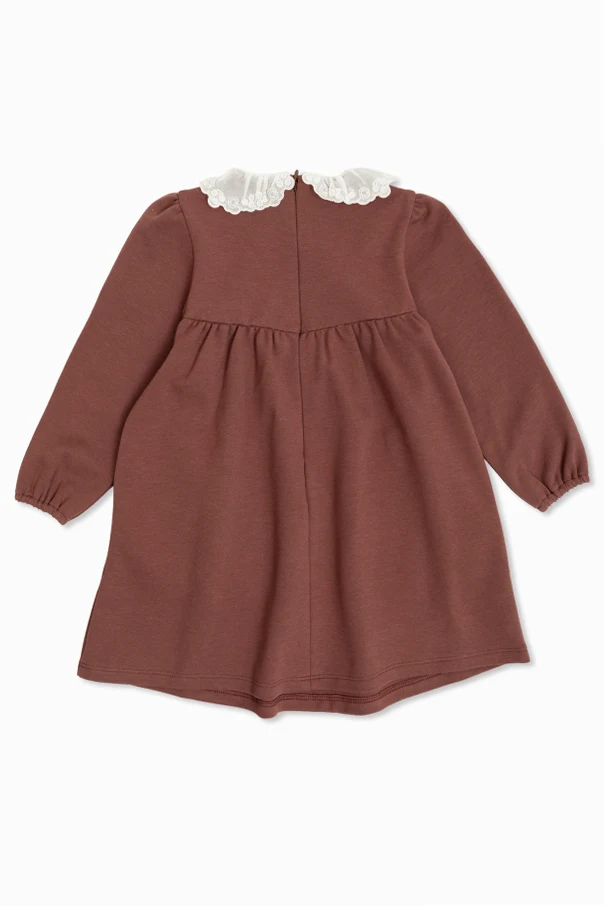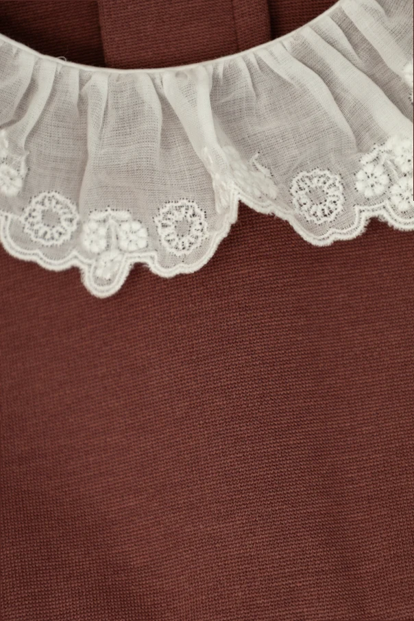 Crafted from a sumptuous blend of modal, cotton, elastane, and polyamide, the dress envelops your child in unparalleled softness. The standout element is its delicate, ruffled white collar , fashioned from translucent organza and adorned with intricate, embroidered floral motifs—offering a sophisticated contrast to the rich, solid brown hue of the main fabric.