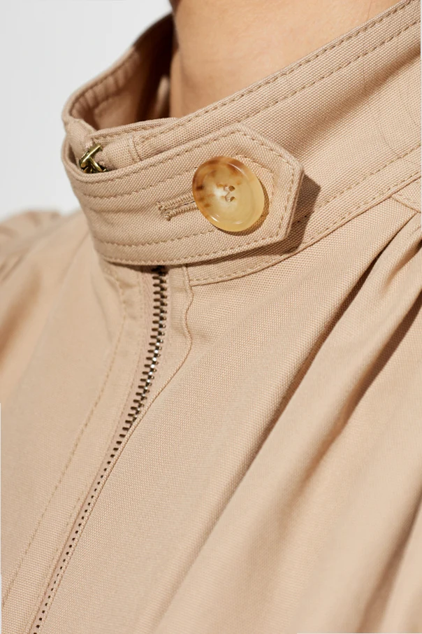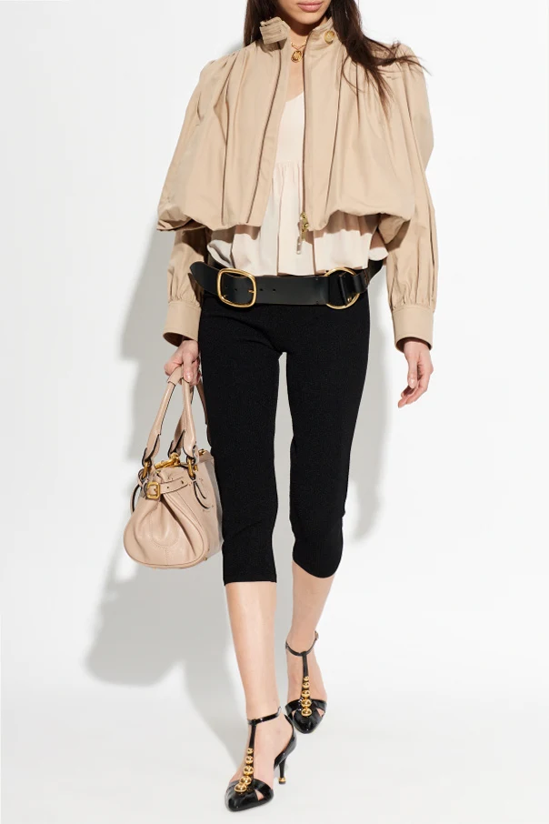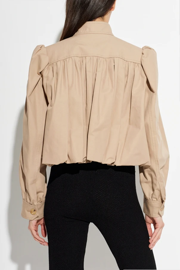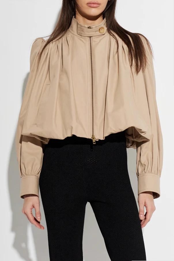 Introducing the Chloé Short Jacket with Pockets—a refined expression of modern sophistication. Rendered in an exquisite shade of beige , this jacket’s short, subtly flared silhouette elegantly rests above the hips, enhanced by a delicately gathered hem for gentle volume. The voluminous sleeves, artfully pleated at the shoulders, culminate in wide cuffs secured with statement tortoiseshell-effect buttons, exuding an air of timeless chic.