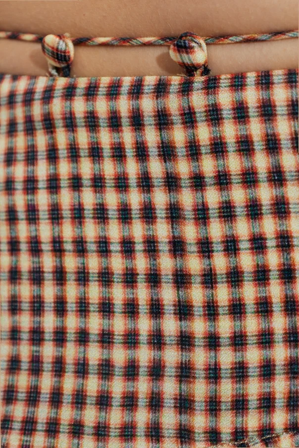 The Tess mini skirt by KNWLS captures a timeless charm with its refined silhouette and expertly crafted details. Rendered in a delicate, classic plaid pattern featuring brown, dark, and cream hues, this skirt recalls vintage sophistication while remaining effortlessly contemporary. The upper portion embraces the figure, gently flaring into a playfully voluminous hem accentuated by a beautifully asymmetric, ruffled finish that imparts dynamic energy and grace.