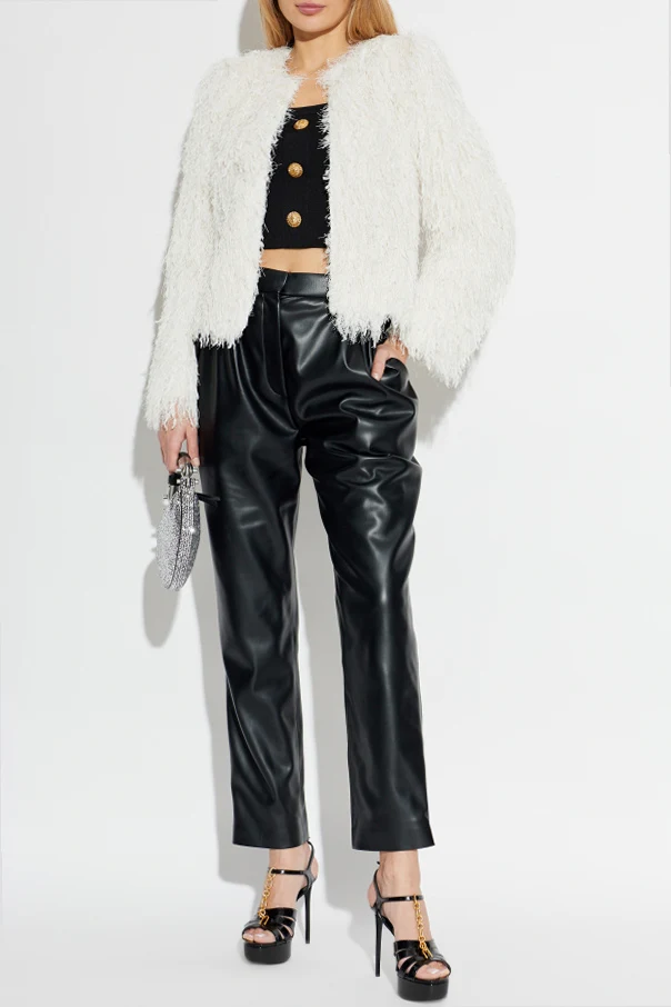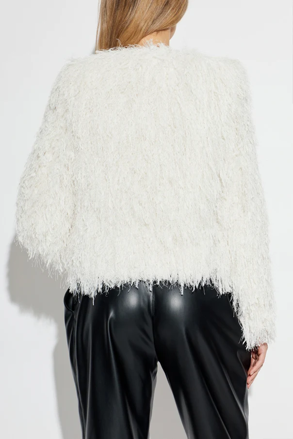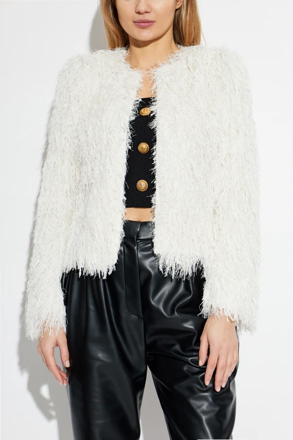 This refined white jacket by Balmain epitomizes contemporary sophistication with its understated yet daring silhouette. Expertly crafted, the piece boasts a straight, slightly boxy shape with gently flared sleeves and a hip-length cut, exuding effortless modernity. The lustrous exterior, woven with decorative threads and sumptuous fringe, evokes a subtly “shaggy” texture reminiscent of faux fur, while shimmering silver lurex threads lend an exclusive, alluring sheen.
