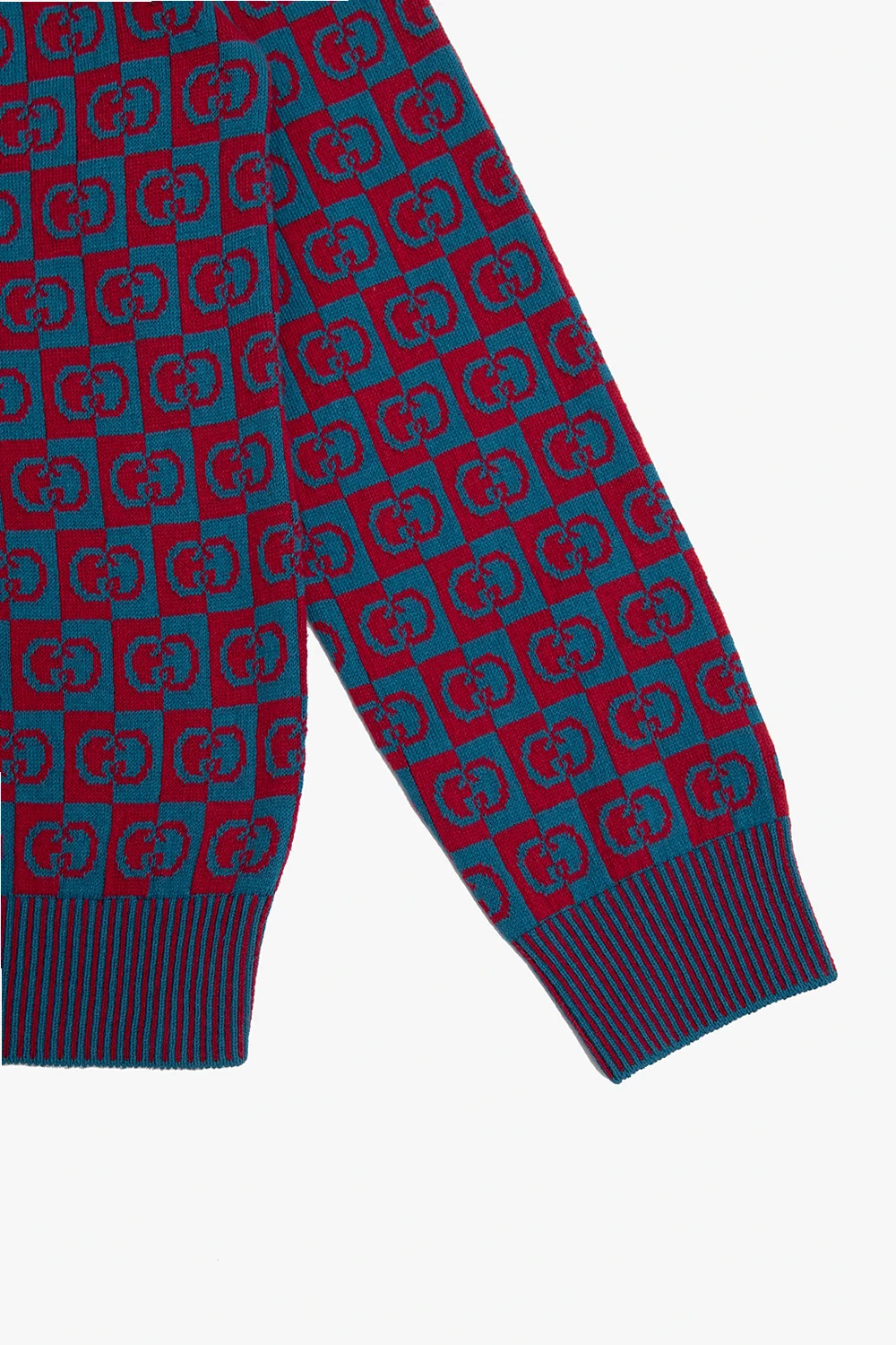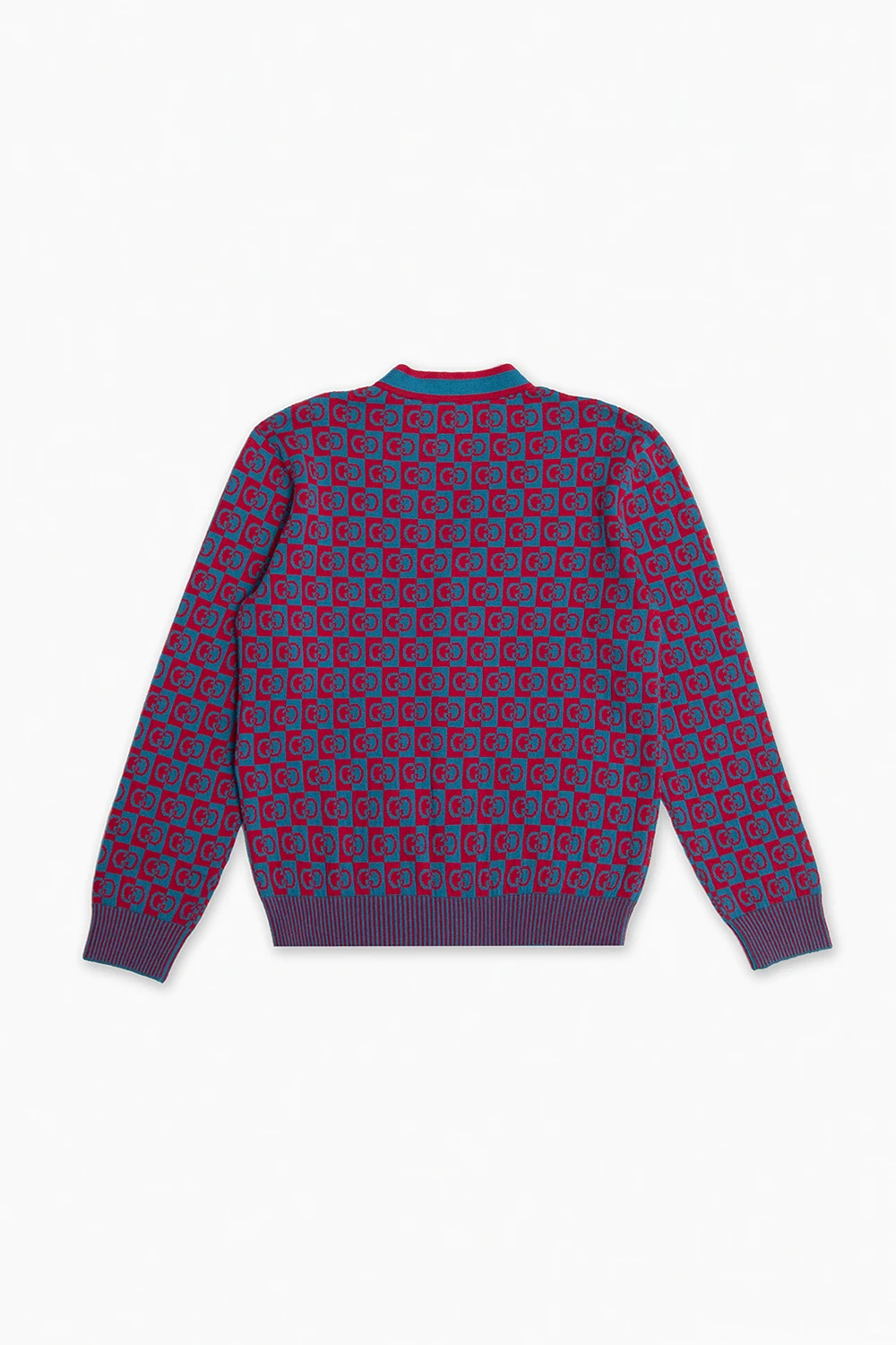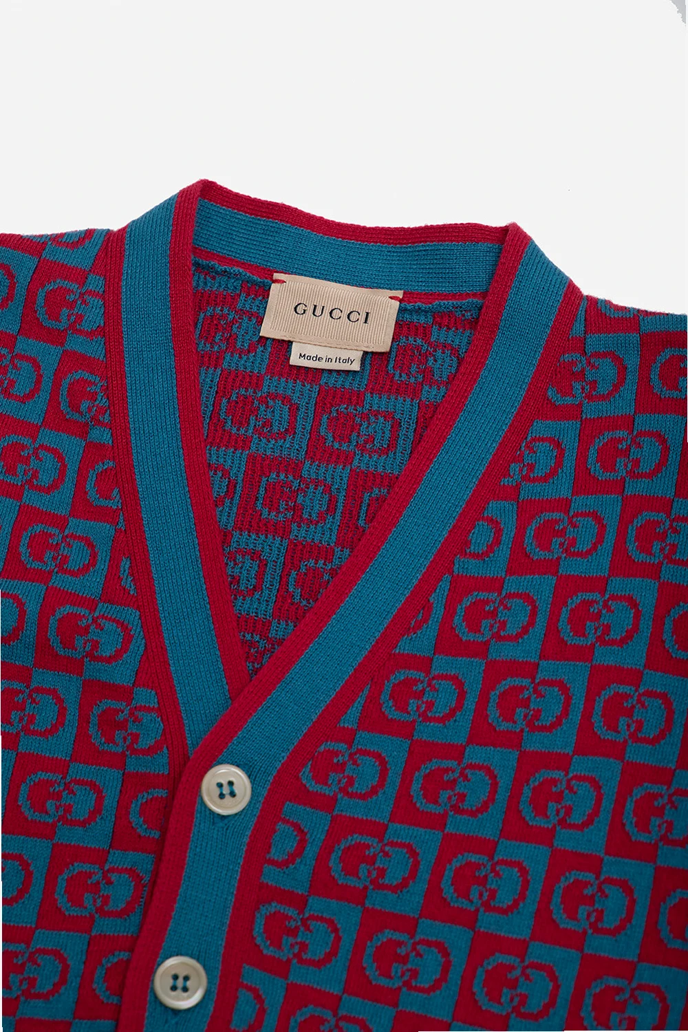 Red and blue cardigan from Gucci Kids. Made of cotton, this style features a V-neckline, long sleeves, button closures and an the ‘GG’ pattern.
