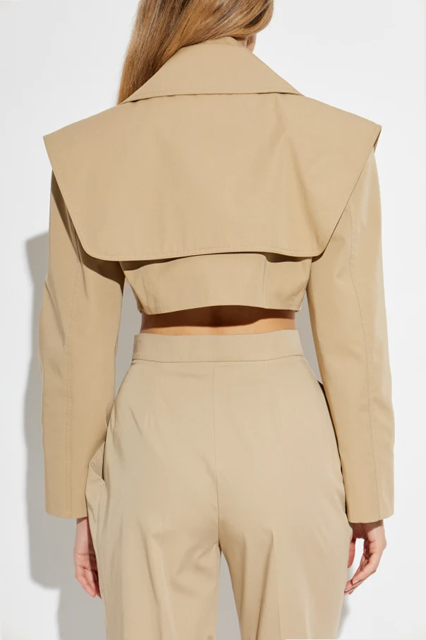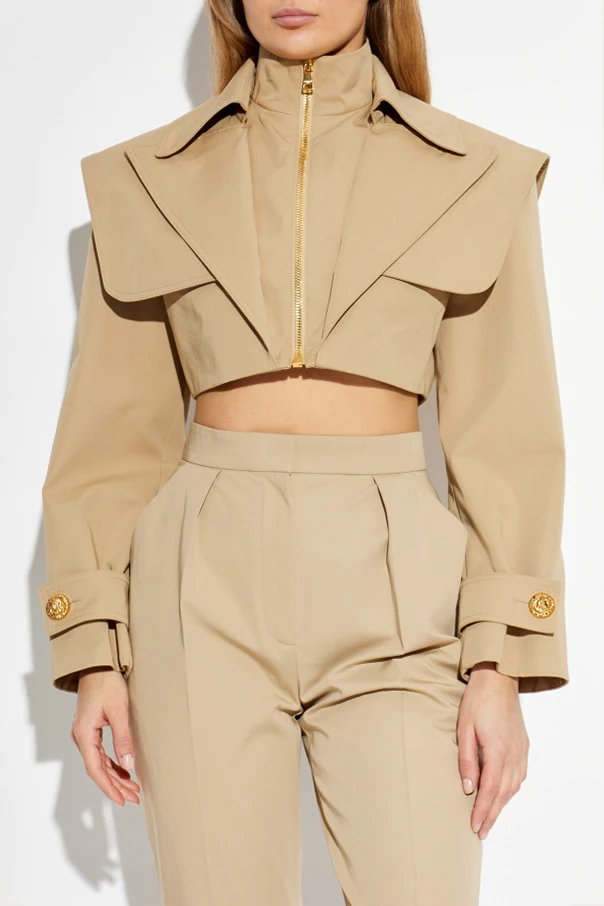Experience the essence of refined sophistication with this short, geometrically contoured jacket from Balmain . Its sharply tailored, form-enhancing silhouette falls just above the waist, punctuated by boldly structured shoulders and an elegant high stand collar that frames the neckline with poise. Minimalist in design, the smooth, jet-black fabric—crafted from the finest cotton with a subtle, structured touch—exudes understated luxury.