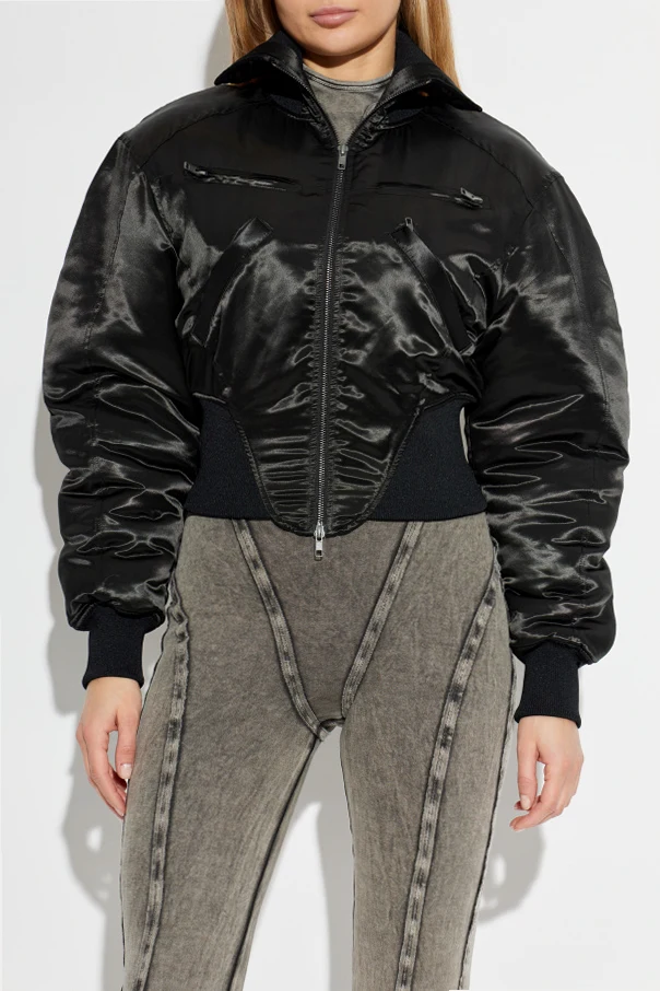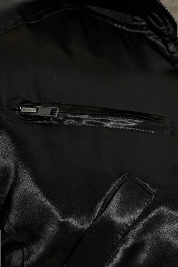 Executed in an elegant jet black hue, this jacket exudes urban luxury, amplified by its lustrous, satin-like finish crafted from premium materials. The sleek front zipper and expertly integrated horizontal zippered chest pockets pay homage to utilitarian inspiration, while the wide, elasticated cuffs and hem promise a tailored, comfortable fit. A subtle designer insignia at the nape discreetly references its unmistakable pedigree.