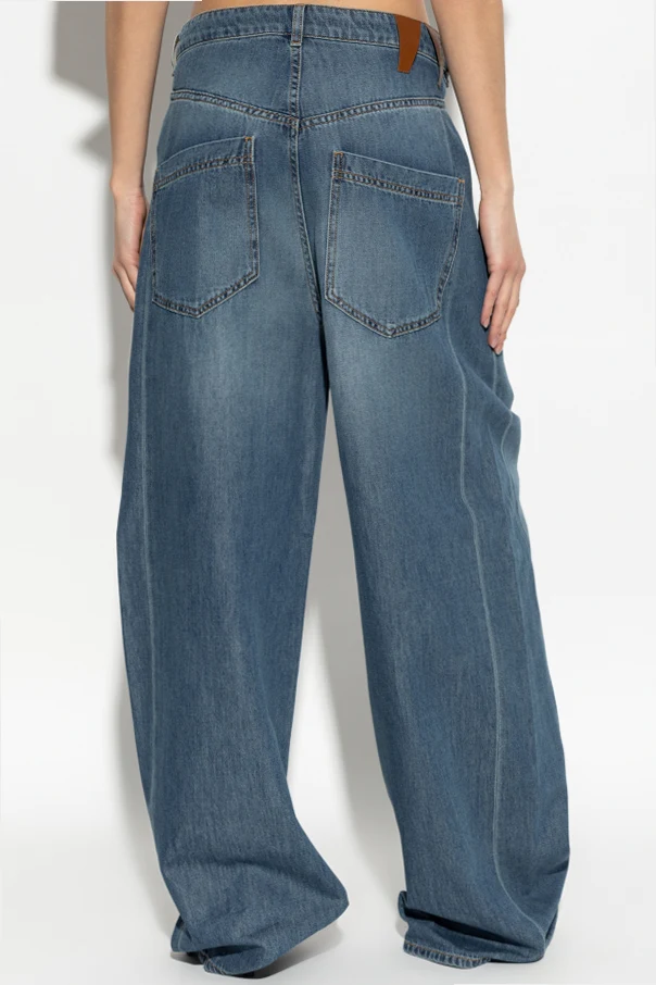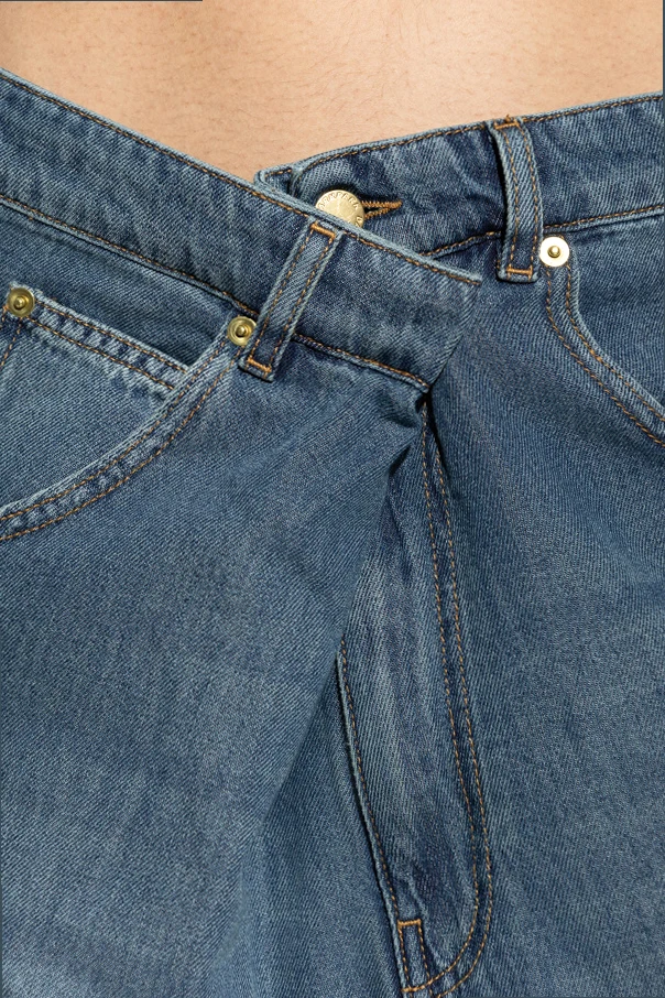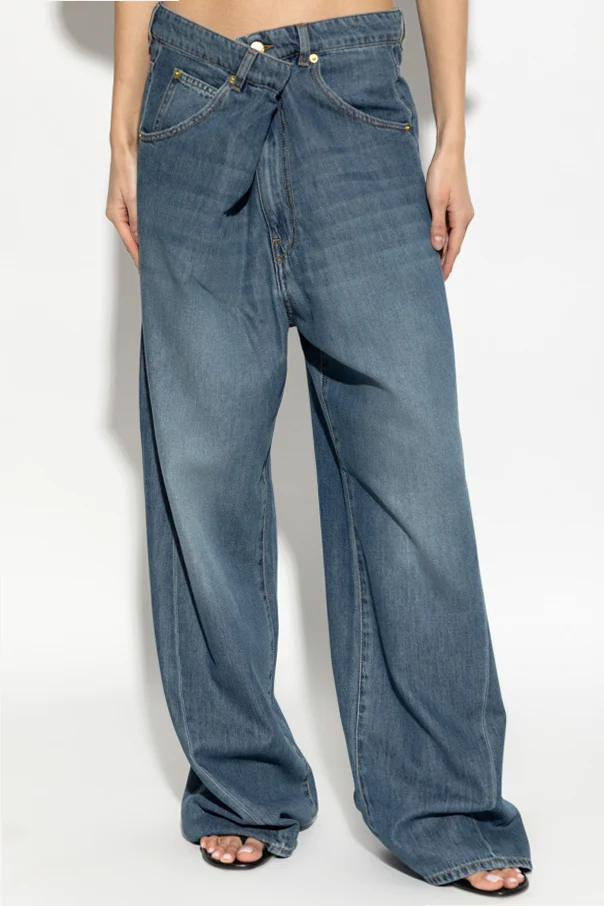 The ‘Ines’ Boyfriend Jeans by DARKPARK present an artful reimagining of classic denim with a daringly modern touch. Exquisitely crafted from lustrous navy blue denim, these jeans feature a voluminous silhouette with wide, effortlessly draped legs and a refined high-rise waist. The distinctively asymmetrical front closure is finished with an angled button and signature overlay, imparting a bold architectural nuance to this timeless staple.