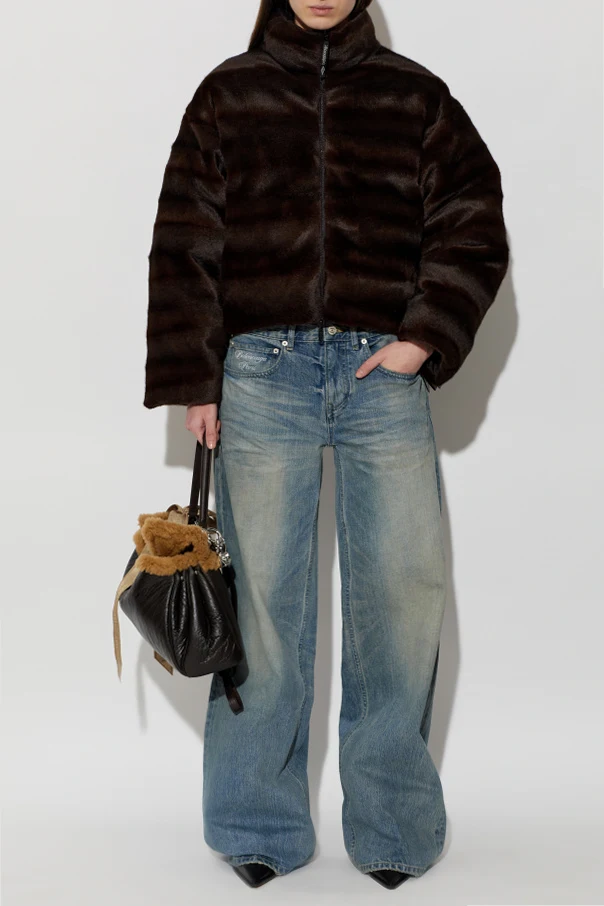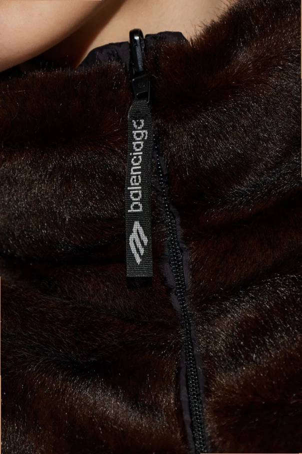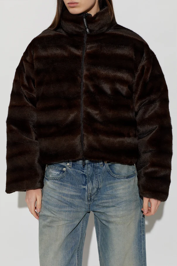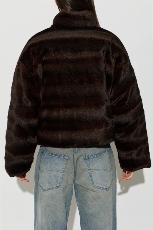 Experience unparalleled sophistication with this reversible brown turtleneck jacket by Balenciaga . Its short, boxy silhouette with gently dropped shoulders and wide, elongated sleeves crafts an effortless fusion of comfort and contemporary refinement. The exterior, crafted from sumptuous faux fur, radiates a lustrous sheen, accented with subtle horizontal shading and delicate ribbed texture, while the smooth, full-bodied feel reinforces its exclusive appeal.