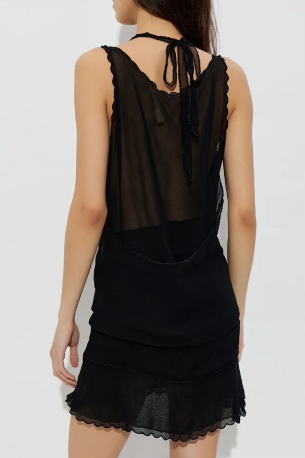 The gently flared hem and the sleeveless, relaxed cut flatter the figure without constraint, while subtle, decorative scalloped trims accent the neckline and straps. A graceful ribbon tie at the back, finished in an elegant bow, adds a touch of playful femininity and distinct charm. This singular piece celebrates sophisticated minimalism for day or night.