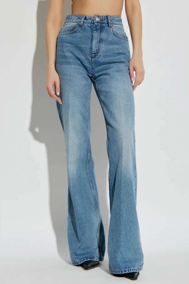 These high-waisted jeans feature a flared cut that gracefully widens from the knee down, creating a silhouette that is both timeless and modern. The alluring blue hue , complemented by a delicate faded effect, enhances their vintage allure.