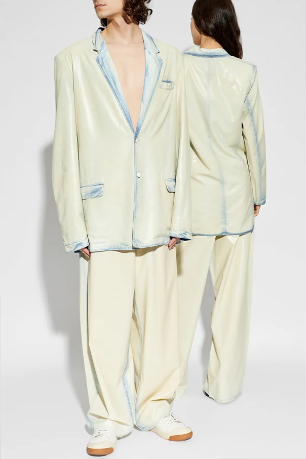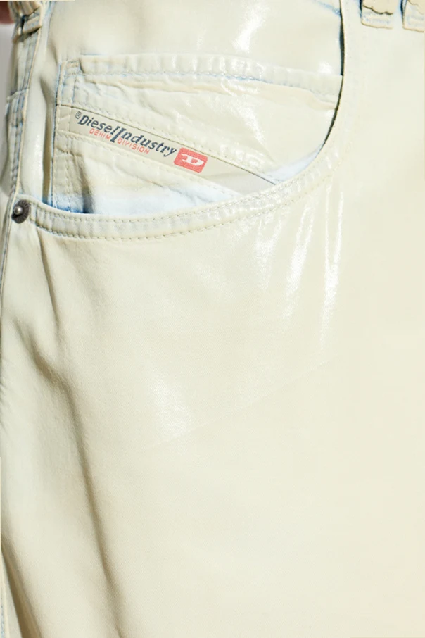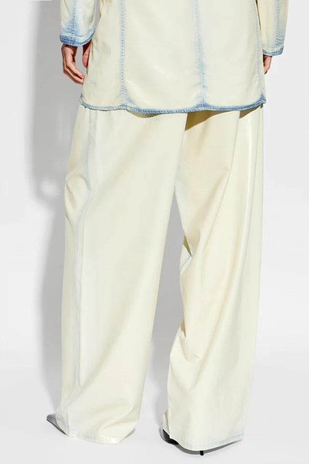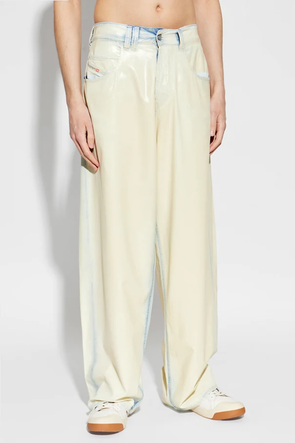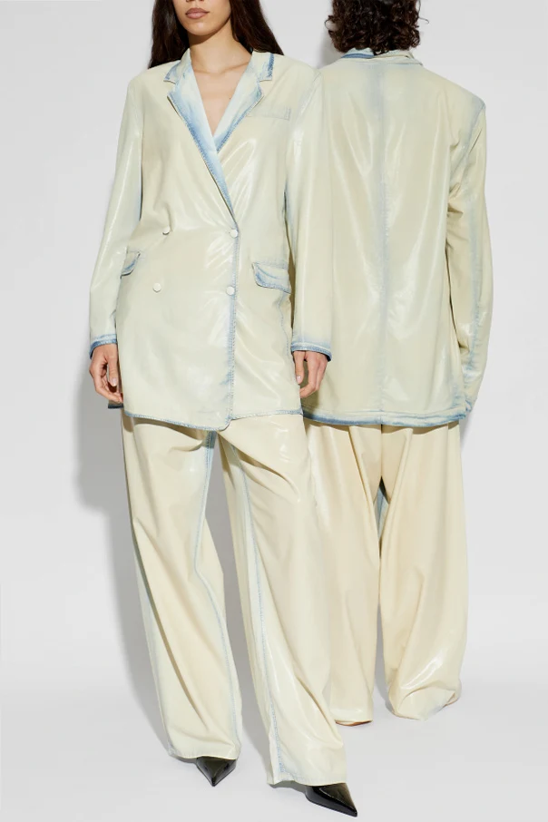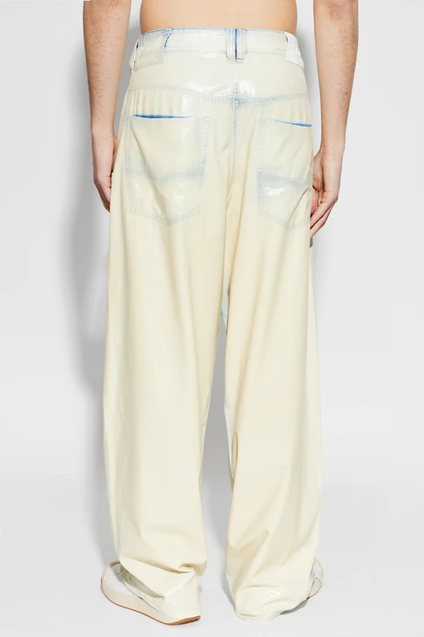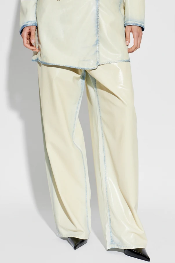Experience understated sophistication with the 1997 D-ENIM-M-FSI pants from Diesel. Rendered in a sumptuous cream shade with a subtle warm undertone, these trousers transcend classic denim with their distinctive glossy, vinyl-like finish . Crafted entirely from premium lyocell, the fabric drapes with fluidity, lending a luxurious touch to this nod to 1990s style.