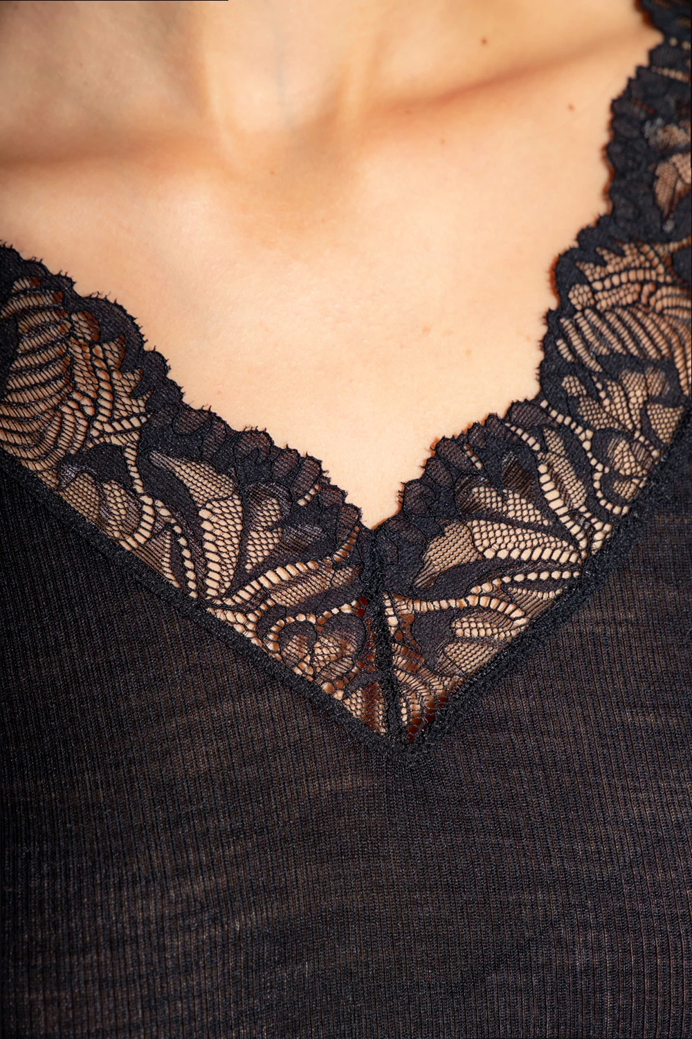 Black ribbed top from Hanro. Crafted from a merino wool and silk blend, this design features 3/4 length sleeves as well as lace-trimmed neck and cuffs.