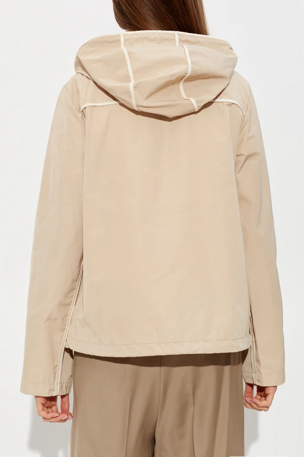 Crafted from a sumptuous blend of light, technical fabric with a subtle matte sheen, the ‘Sarracenia’ jacket presents an elevated casual aesthetic. The adjustable hood is accented by drawstrings tipped with polished metal ends for a touch of opulence. A striking appliqué logo in navy, red, and white on the left chest marks its designer heritage, while a full-length, contrasting zipper adorned with a brown-toned pull and metal detail adds a modern distinction.