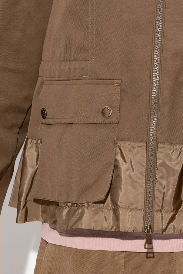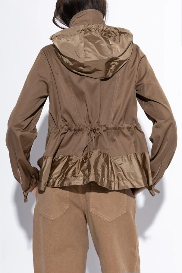 Thoughtfully designed, a slightly loose, straight cut flatters the form, while an adjustable drawstring waist ensures a customized fit. The back is elegantly finished with a delicately flared, pleated section, augmenting its allure. Signature features include a robust, exposed metal zipper, and two generous hip-level flap pockets secured by polished snap buttons. Adjustable drawstrings at the hood, waist, and cuffs provide both versatility and comfort, defining its uniquely tailored appeal.