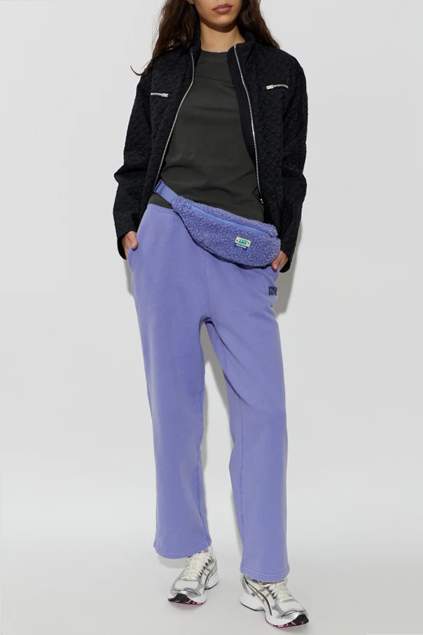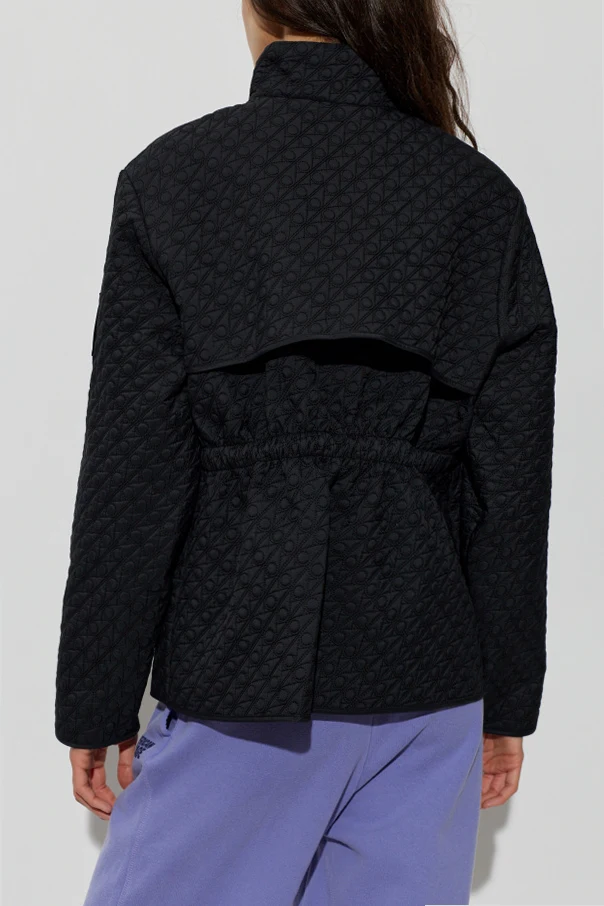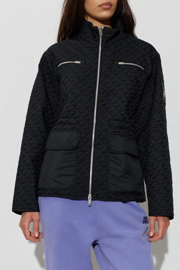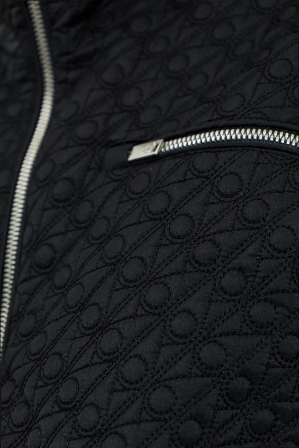 The entire surface is adorned with a geometric quilt featuring circular and diagonal motifs, imbuing the piece with both texture and visual intrigue. Contrasting smooth panels distinguish the lower portions and select pockets, artfully elevating the design.