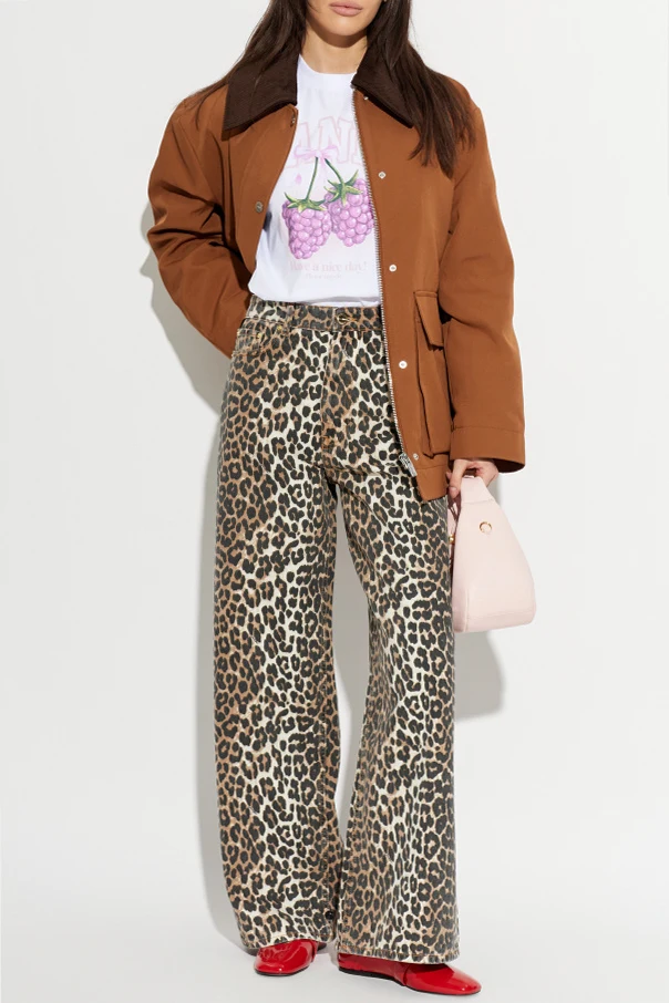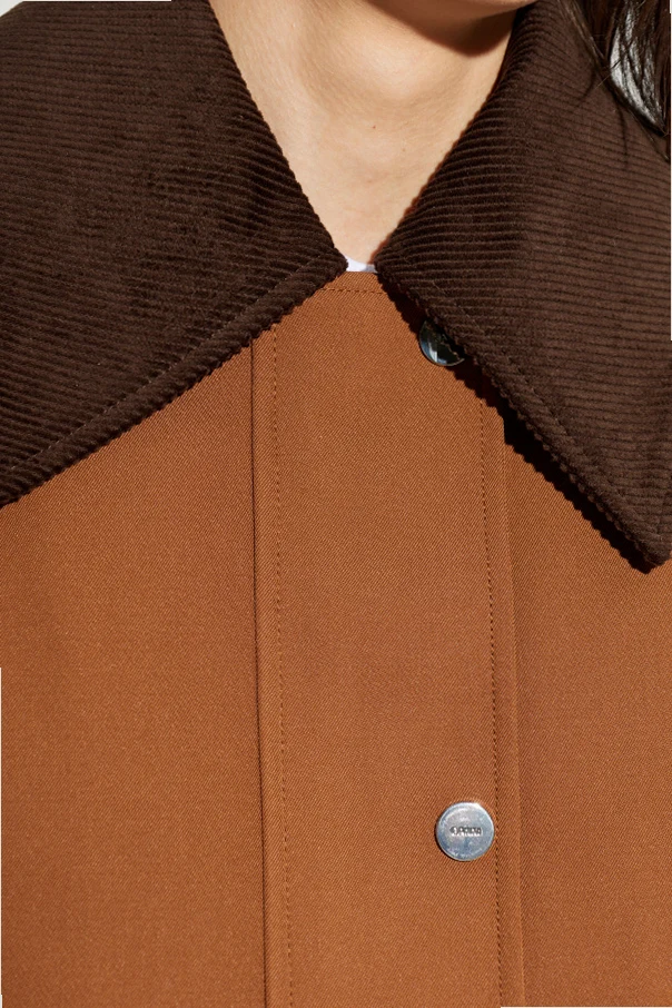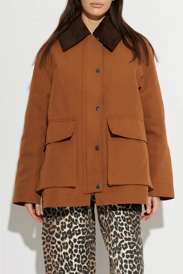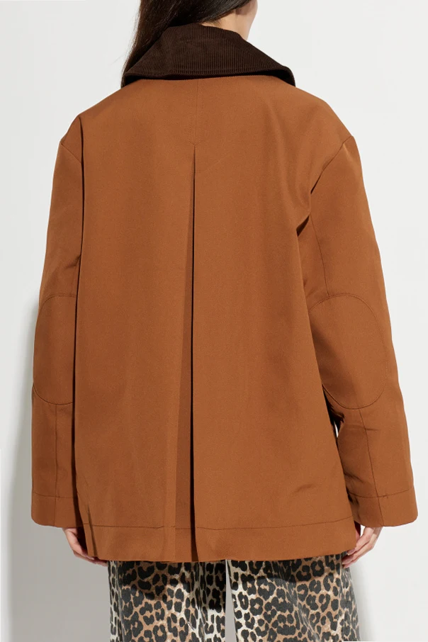 Embrace a refined sense of ease with this oversize jacket by Ganni , distinguished by its effortlessly modern silhouette. The garment’s caramel brown tone is tastefully contrasted by a ribbed corduroy collar in rich chocolate brown, exuding both warmth and sophistication in its minimalist, print-free design.