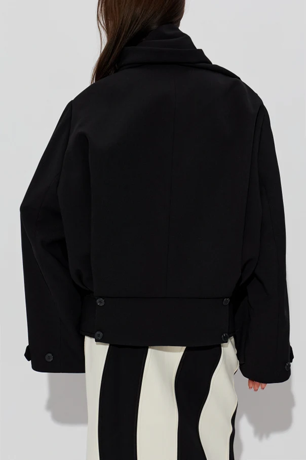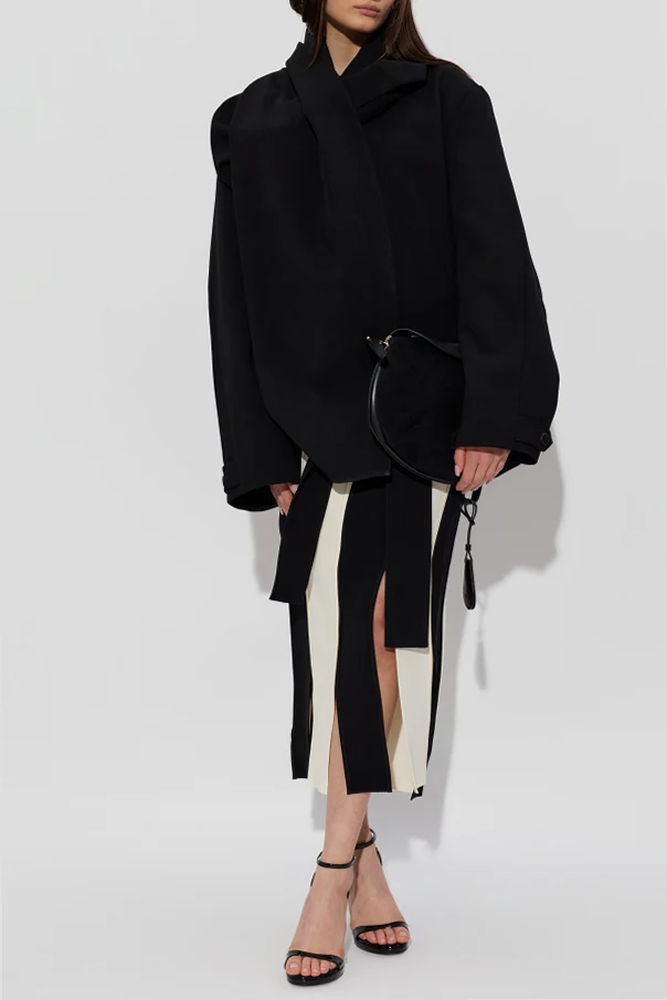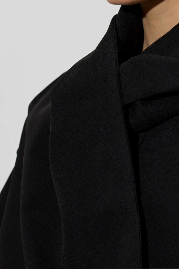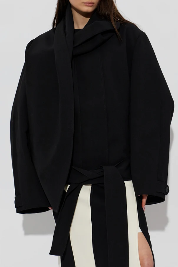 Epitomizing contemporary sophistication, this Belted Jacket by ENTIRE STUDIOS blends modernity with understated elegance. Crafted in a rich, deep black , its fluid silhouette offers a relaxed, subtly oversized shape, complemented by broad sleeves and a clean, straight shoulder line. The jacket's minimalist, unadorned exterior highlights the tactile luxury of its premium, matte fabric—robust and refined, with a graceful drape suggesting woolen quality.